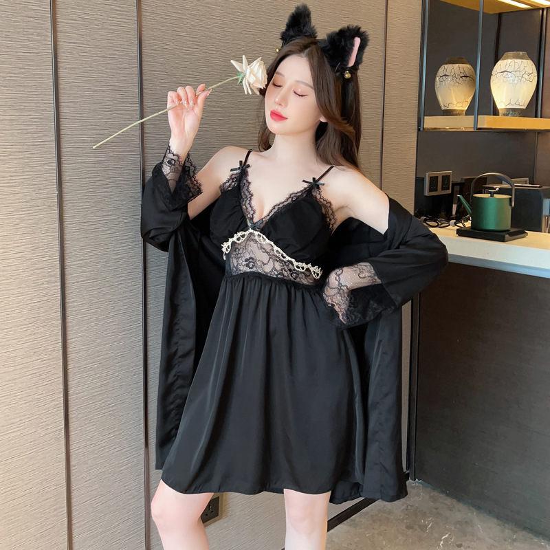 • 판타지 블랙 새틴 실크 투피스 세트(잠옷+가운)