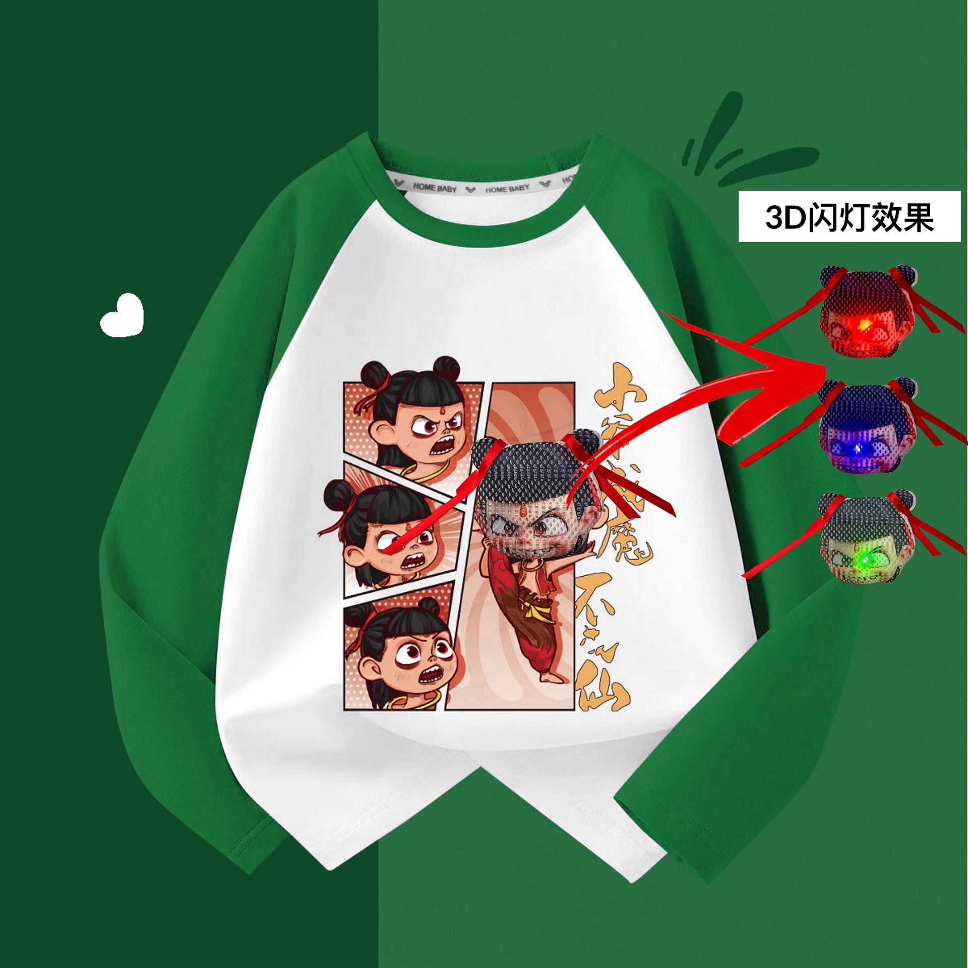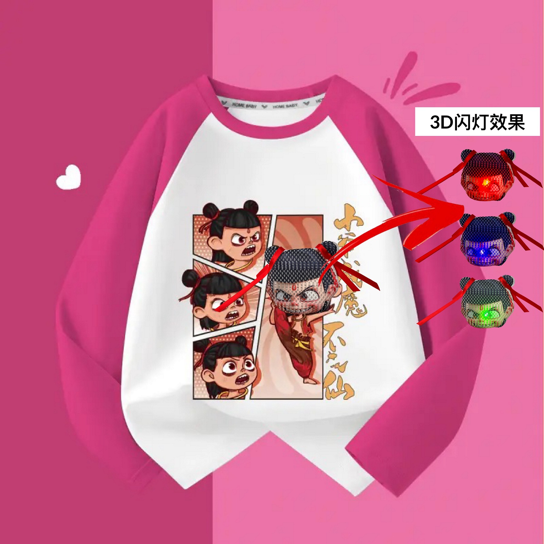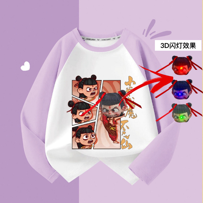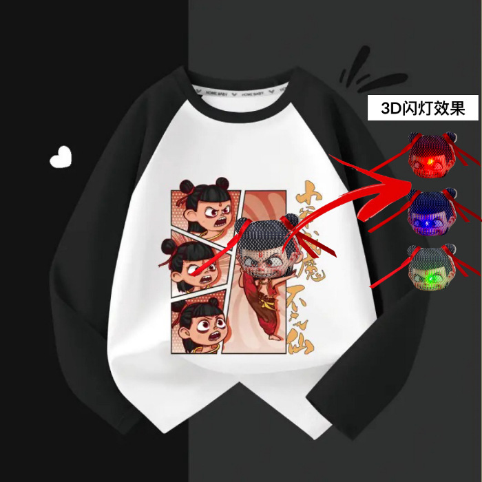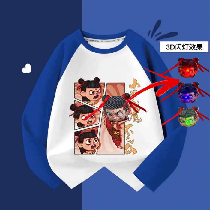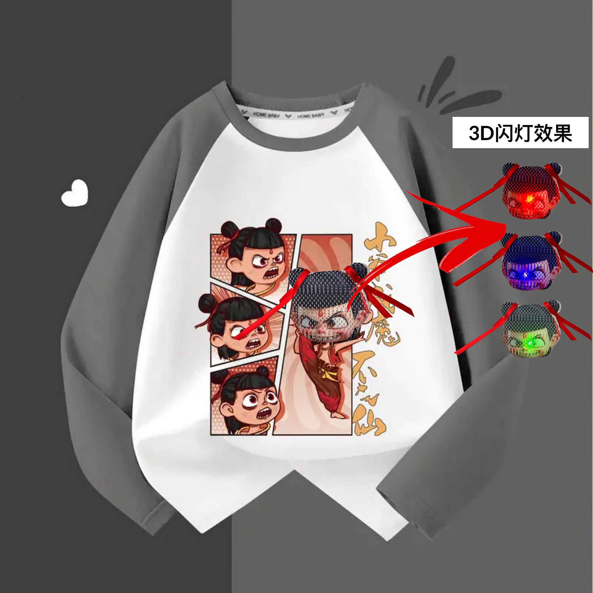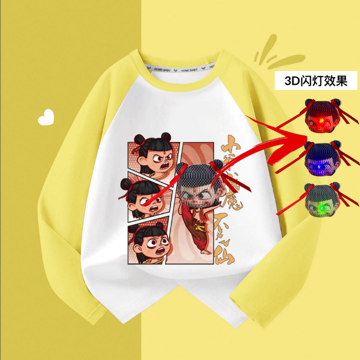100% 면 폭발 귀여운 3D 플래시 조명 어린이 티셔츠 외국 스타일 창조적 인 만화 조명 긴 소매 셔츠스토어 가기