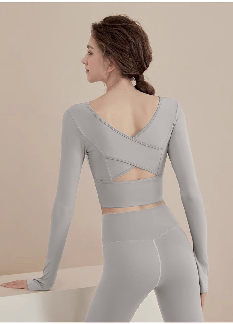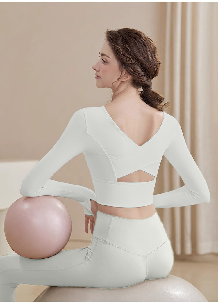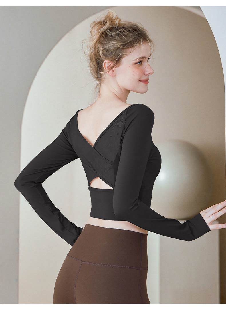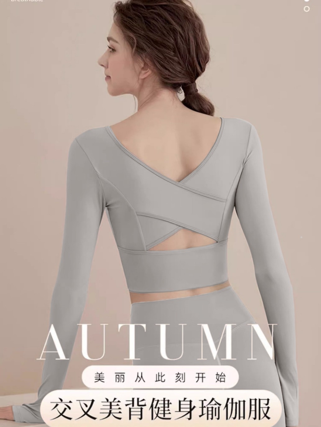 가슴 패드가 있는 요가복, 봄, 가을 긴팔 크로스오버, 아름다운 등, 슬리밍 스포츠 긴팔 피트니스복, 여성용 슬림 핏 및 푸쉬업