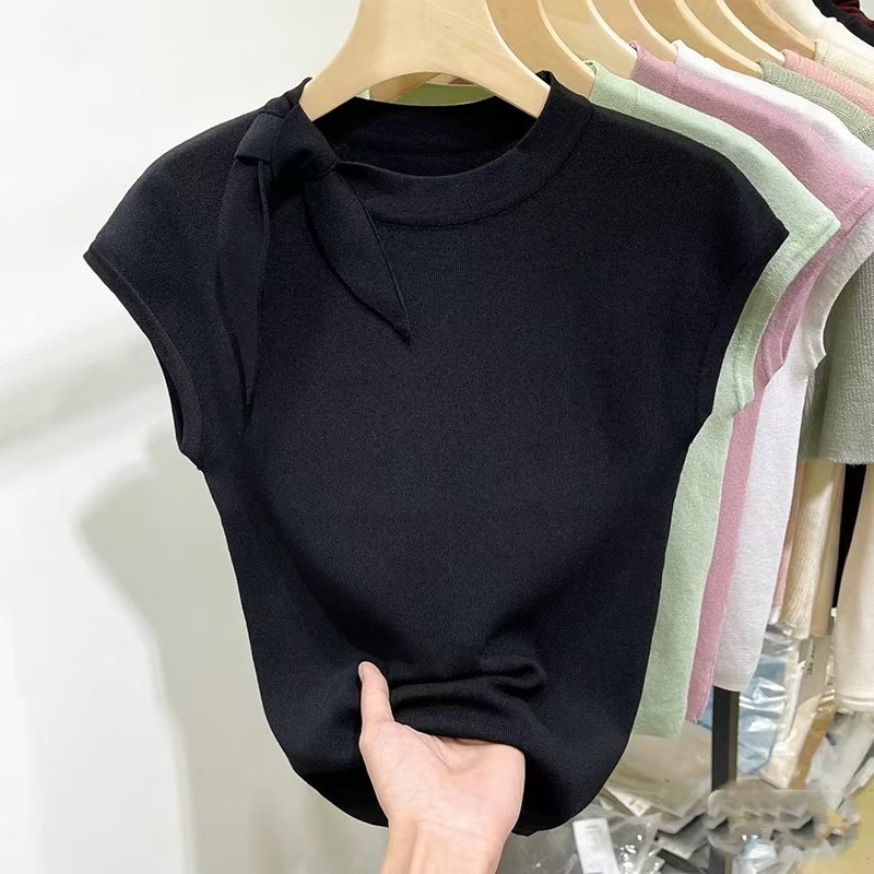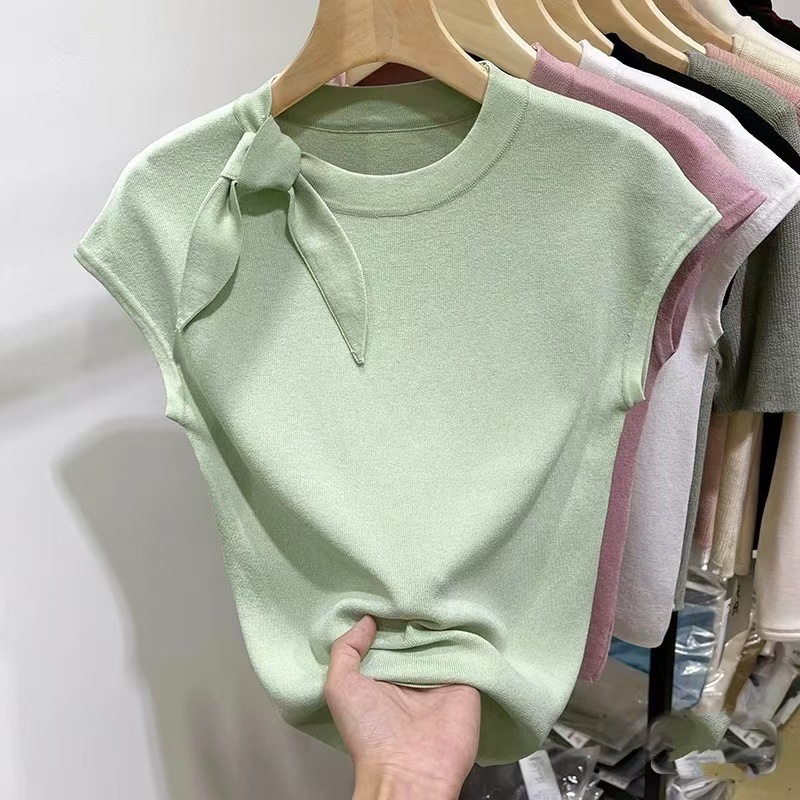 스트랩 크루 넥 쿨 반팔 니트 티셔츠 여성 2025 년 여름 새 스타일 연예인 여성 슬림 핏 조커 플라잉 슬리브 셔츠스토어 가기