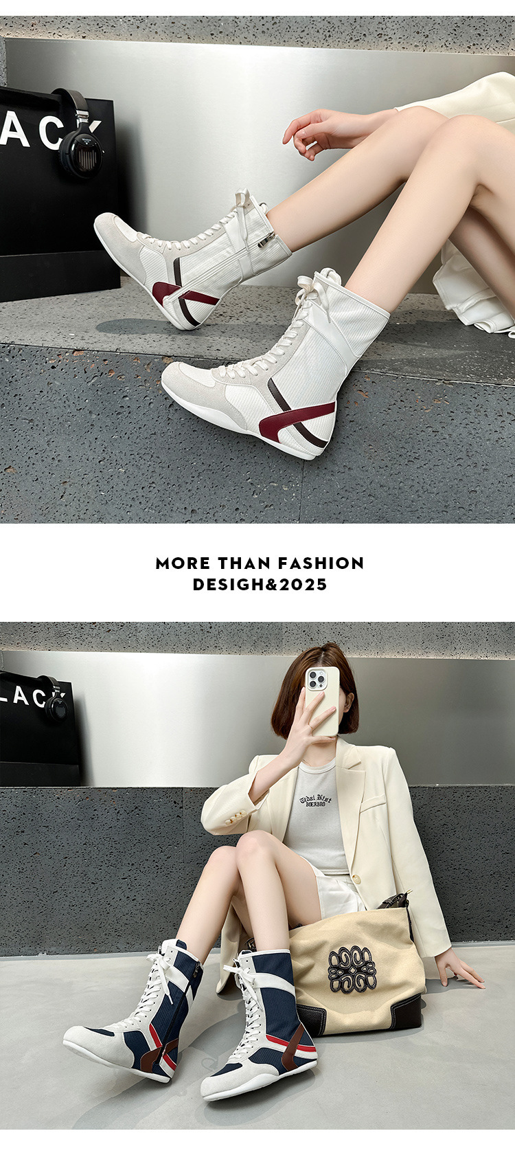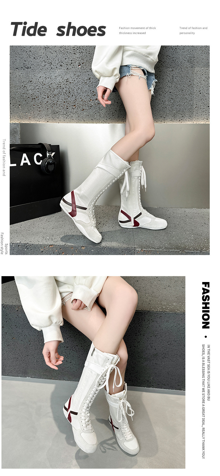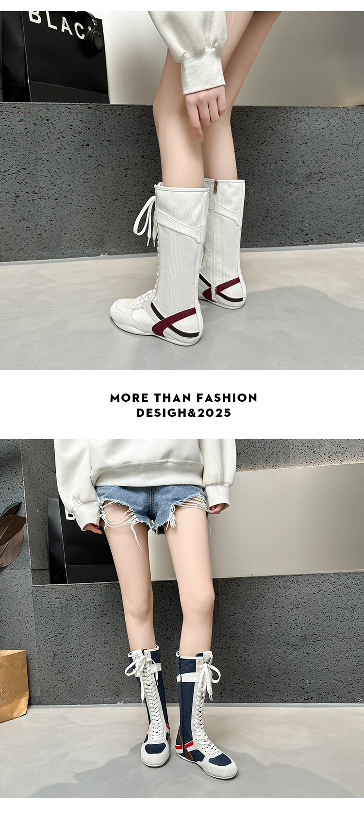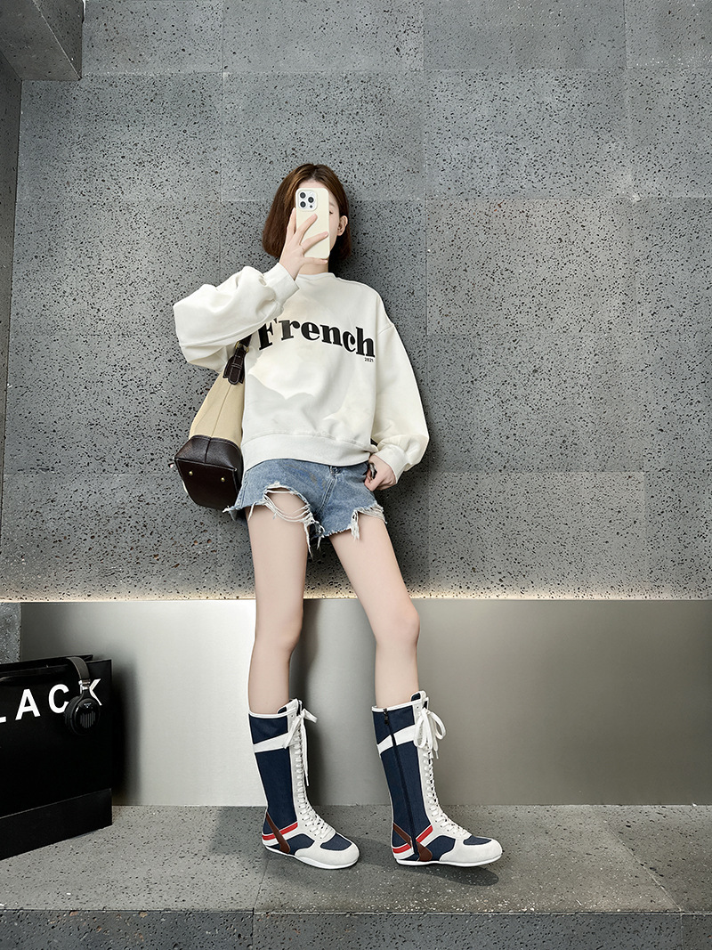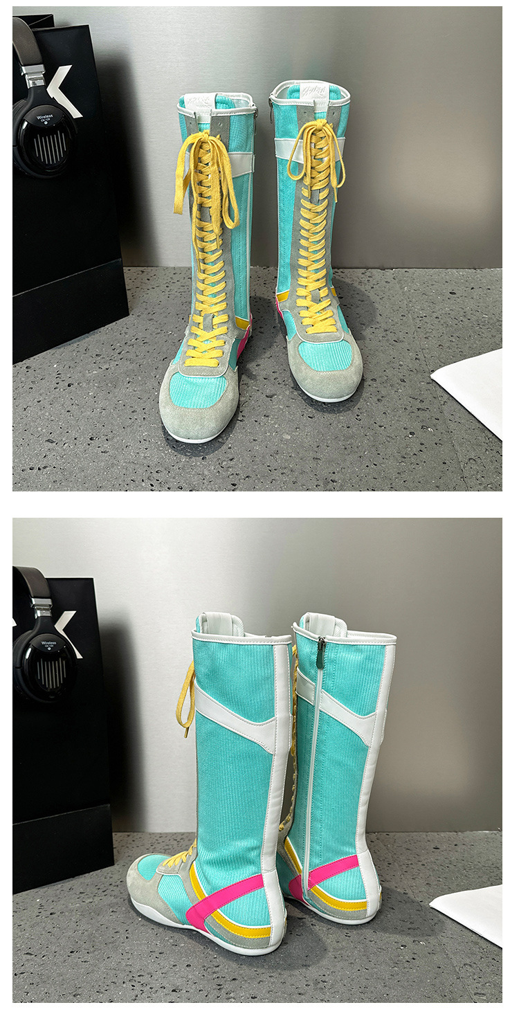 봄과 여름 2025 정품 가죽 하이 사이드 지퍼 소프트 하단 캐주얼 인테리어 높이 증가 유행 색상 매칭 스트랩 플랫 하단 부츠스토어 가기