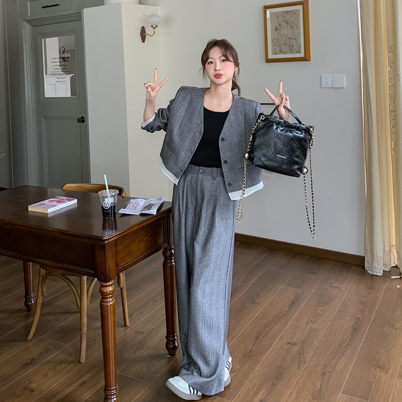 2025 세트 새로운 한국식 분위기 넓은 다리 바지 투피스 세트 리얼 샷 그레이 달콤한 시원한 대비 컬러 스티칭 작은 세트스토어 가기