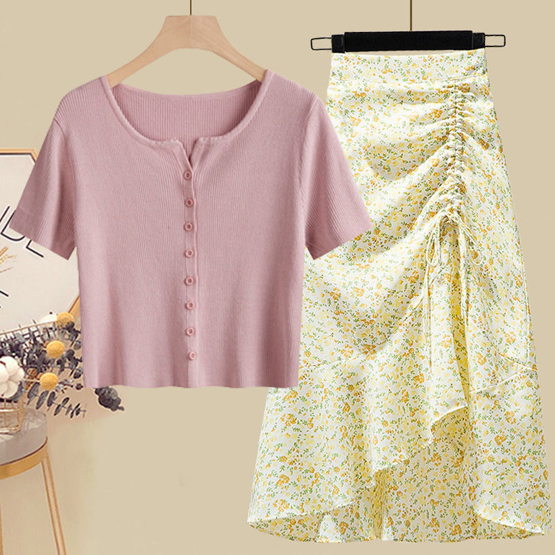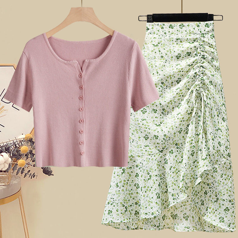 • 5215 핑크탑+그린 꽃무늬 스커트 투피스세트