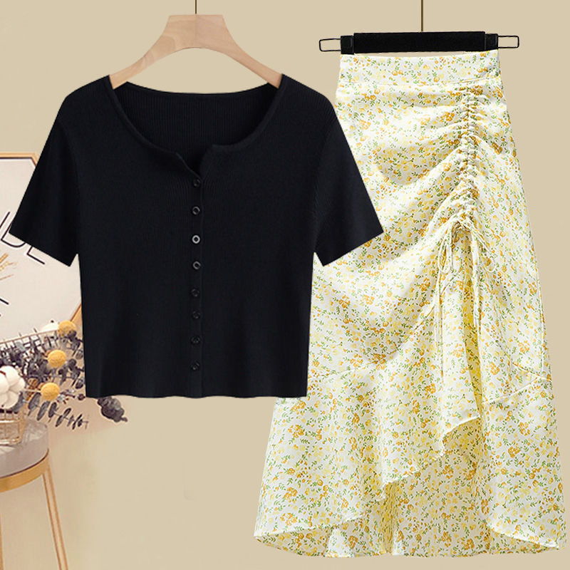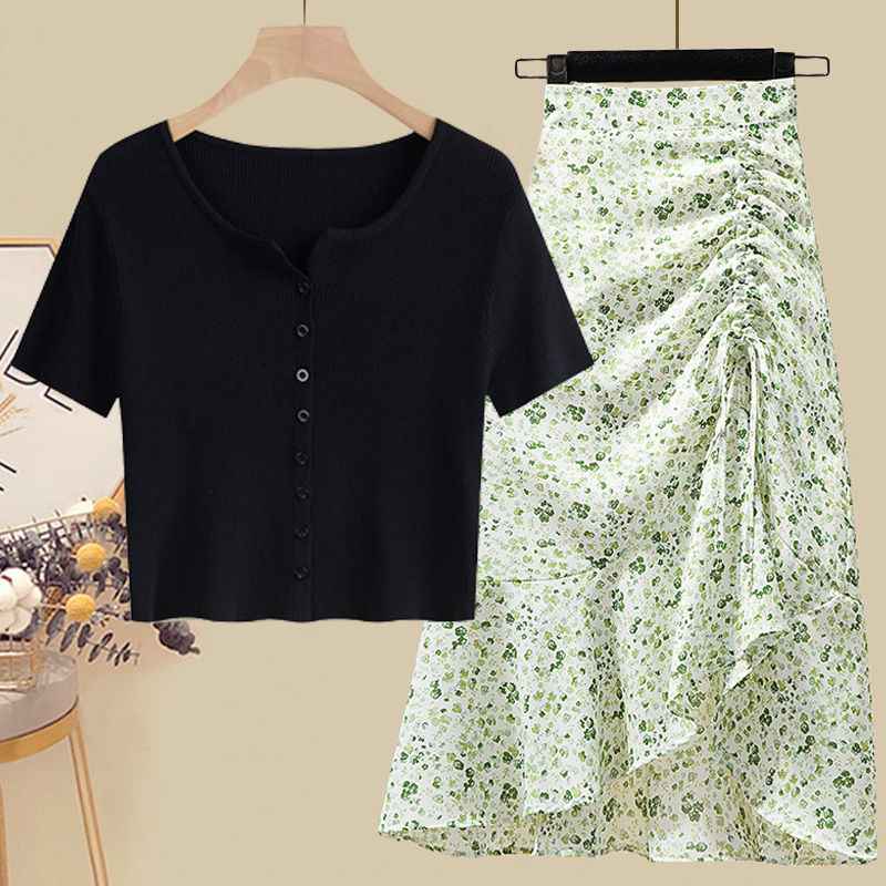 • 5215 블랙탑+그린 꽃무늬 스커트 투피스세트