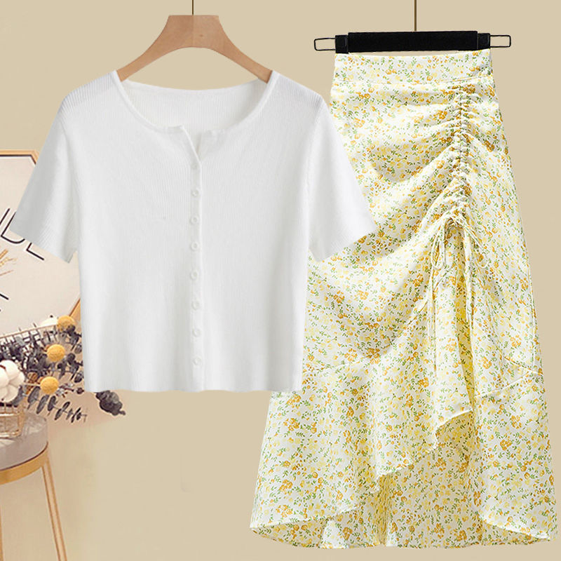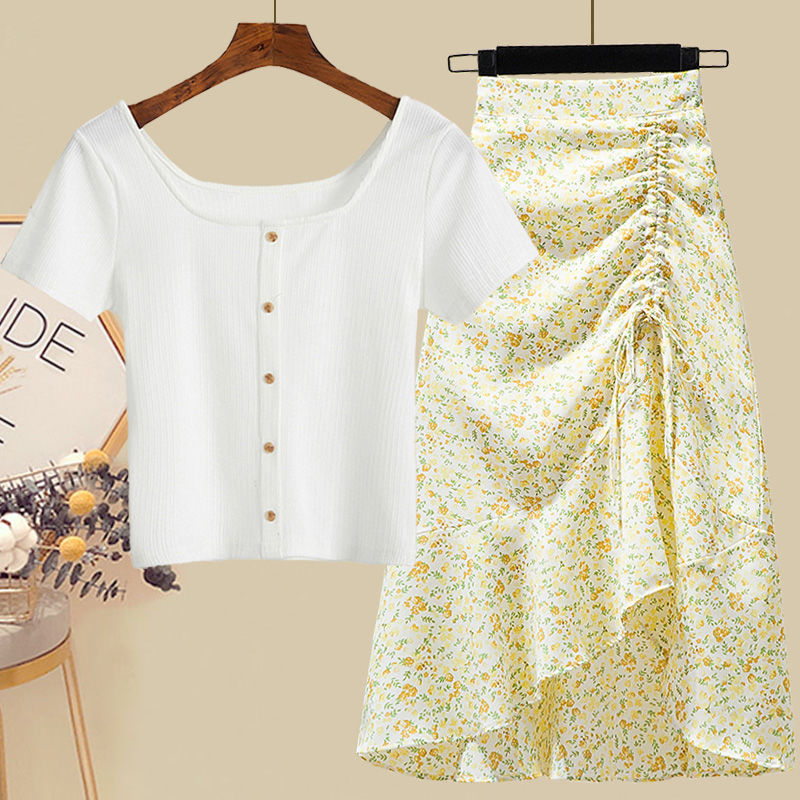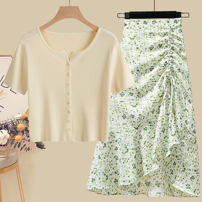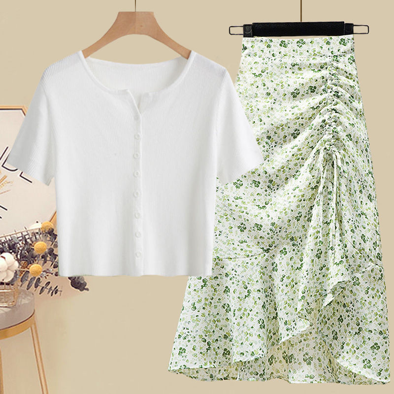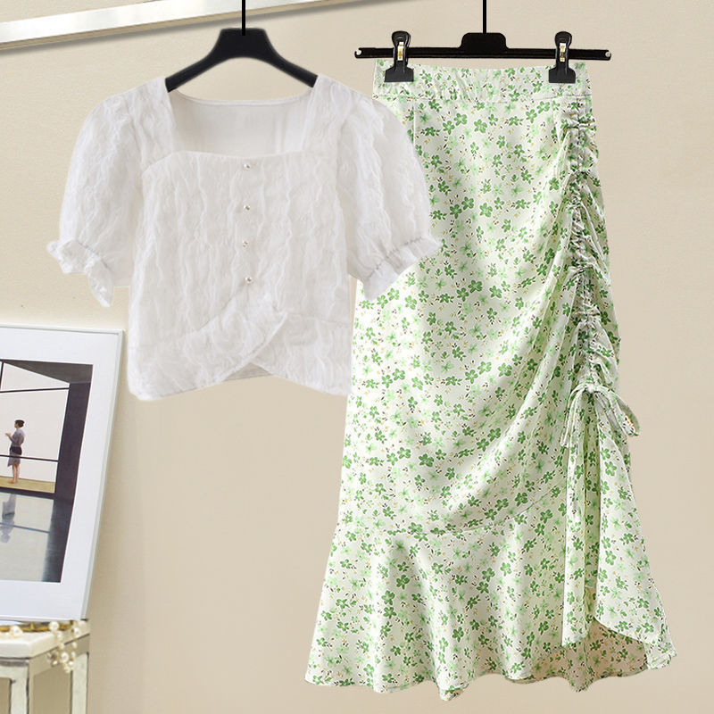 • 화이트 탑 + 그린 꽃무늬 스커트 [투피스세트]