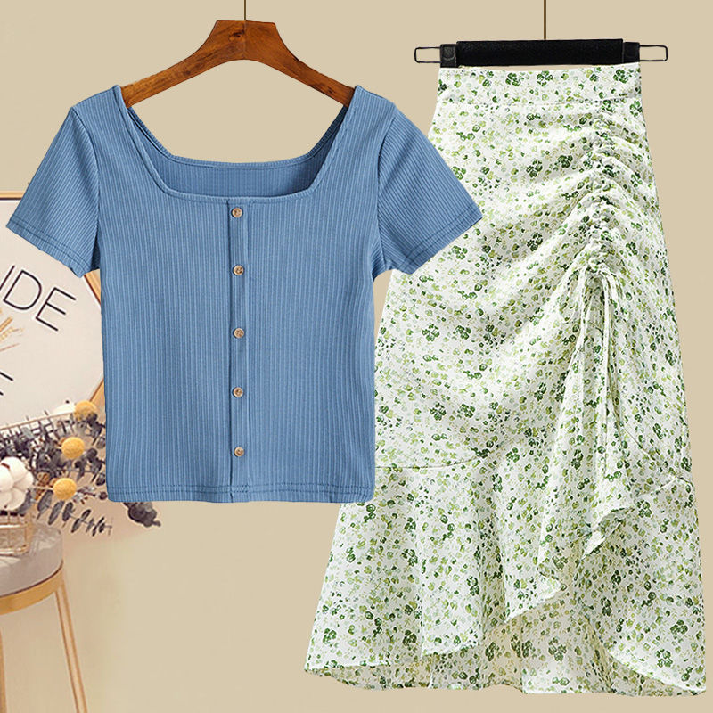 • 5215 블루탑+그린 꽃무늬 스커트 투피스세트