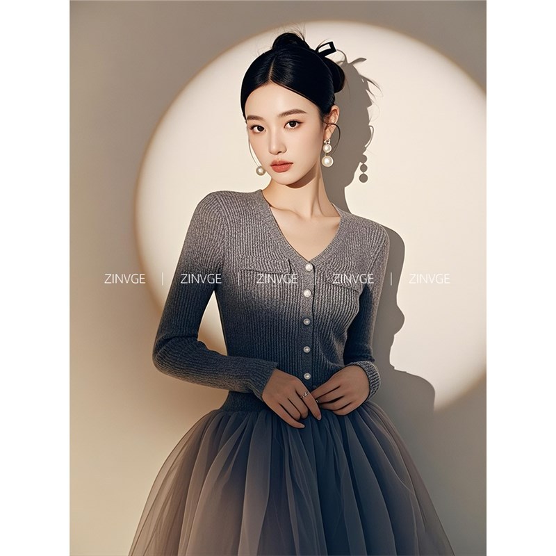 YT410535 부자 딸 착용 회색 v 칼라 니트 원피스 여성의 2025 새로운 이른 봄