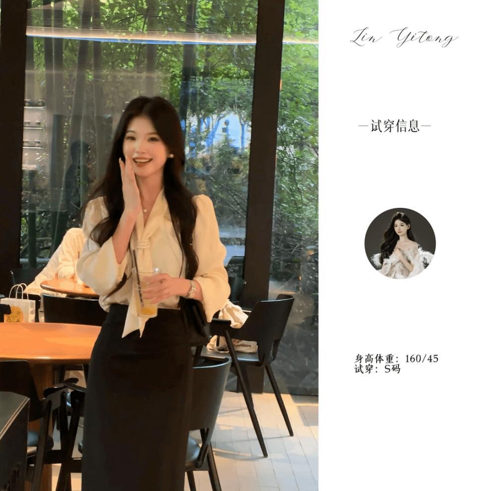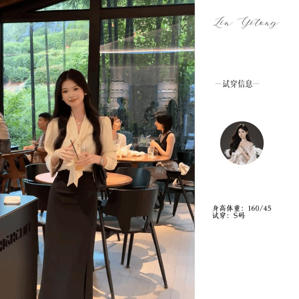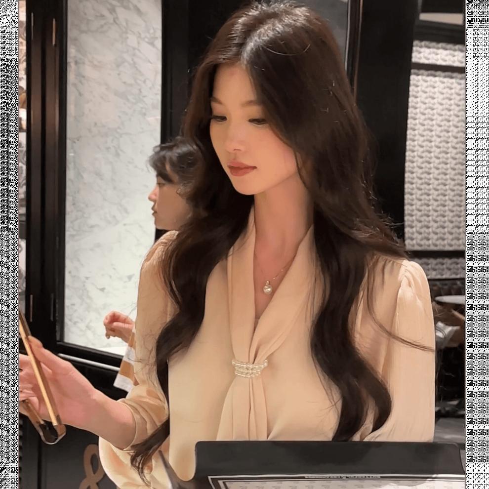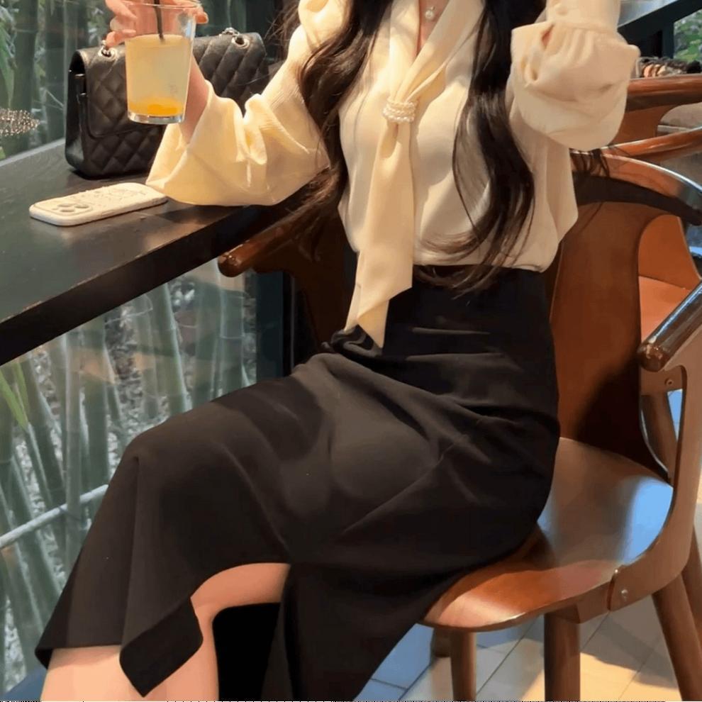 • 살구 셔츠 + 블랙 스커트, 프리 네크라인 비즈