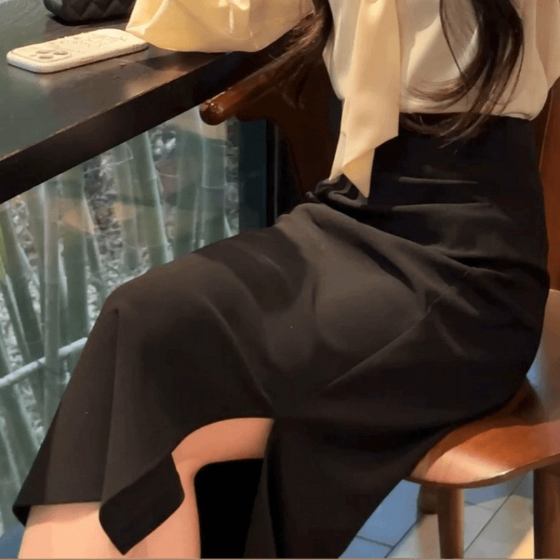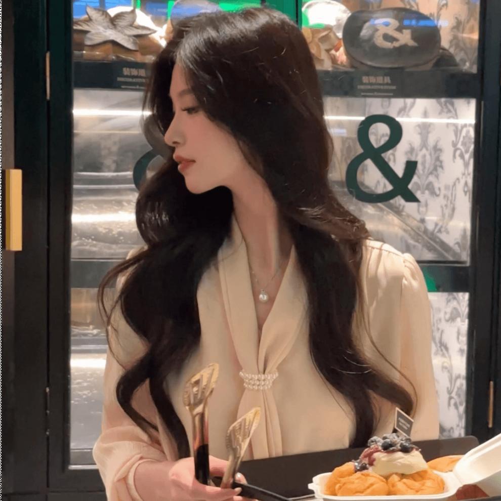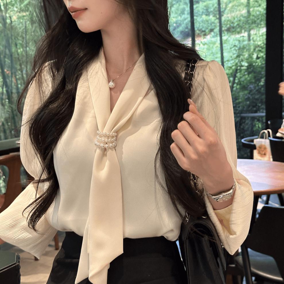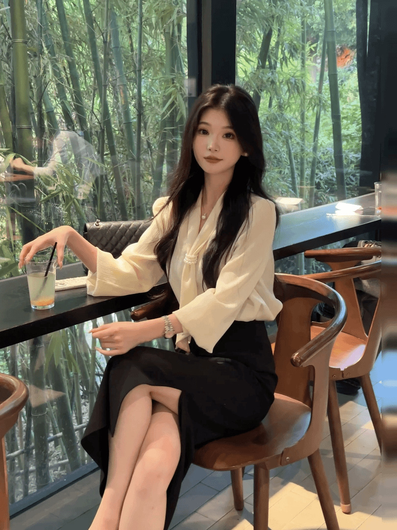 • 살구 셔츠 + 블랙 스커트, 프리 네크라인 비즈