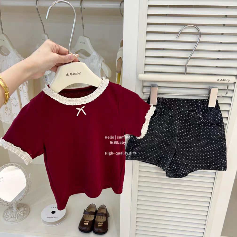 여자 여름 칼라 레이스 반팔 티셔츠 서양식 캐주얼 폴로 도트 데님 반바지 아기 소녀 한국식 투피스 세트