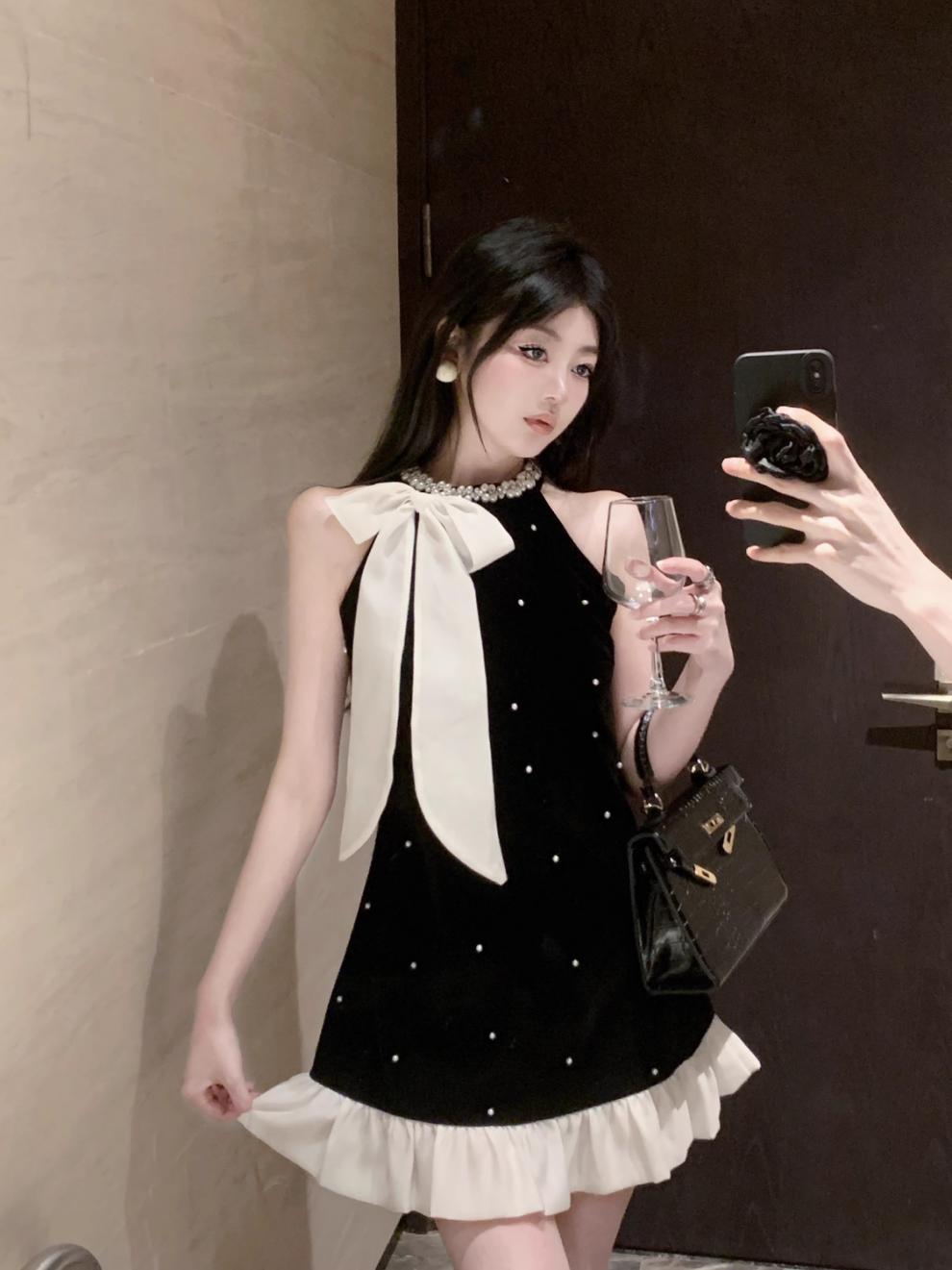 활 목 검은 슬링 원피스 느슨한 슬리밍 소녀의 봄과 여름 A 라인 스커트