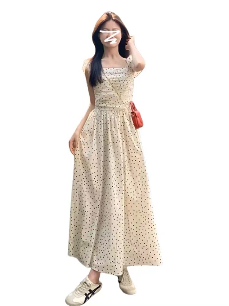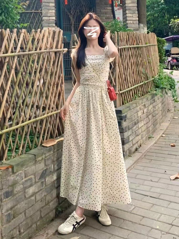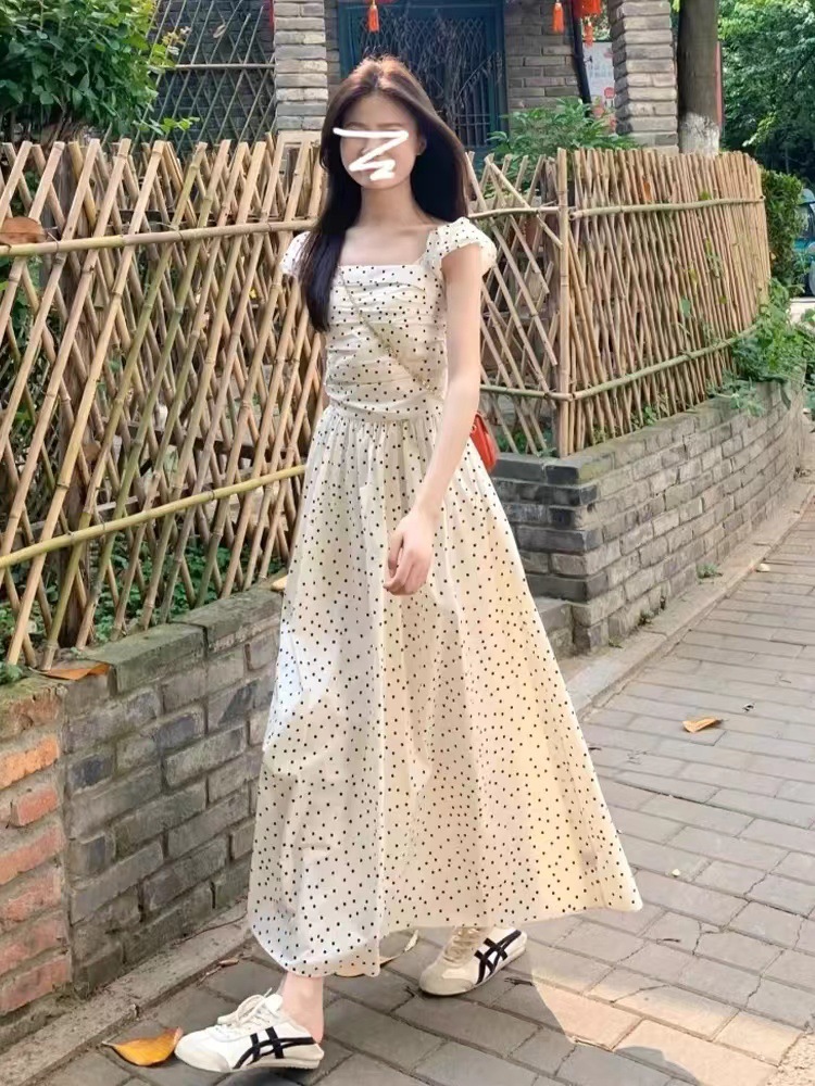 티 브레이크 프렌치 스퀘어 칼라 작은 플라잉 슬리브 폴로 도트 원피스 여성 여름 디자인 센스 틈새 슬림 핏 슬리밍 우아한 롱 원피스스토어 가기