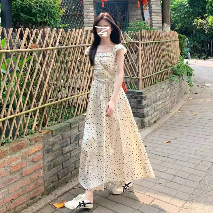 티 브레이크 프렌치 스퀘어 칼라 작은 플라잉 슬리브 폴로 도트 원피스 여성 여름 디자인 센스 틈새 슬림 핏 슬리밍 우아한 롱 원피스