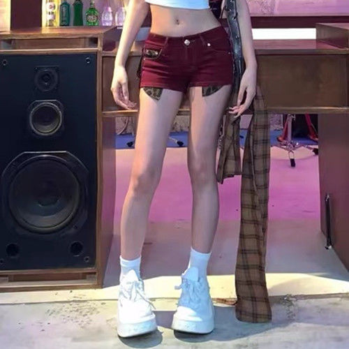 뜨거운 소녀 데님 반바지 여성 디자인 새로운 낮은 허리 A 자형 슬림 핏 슬리밍 레오파드 무늬 스티칭 빨간색 작은 뜨거운 바지