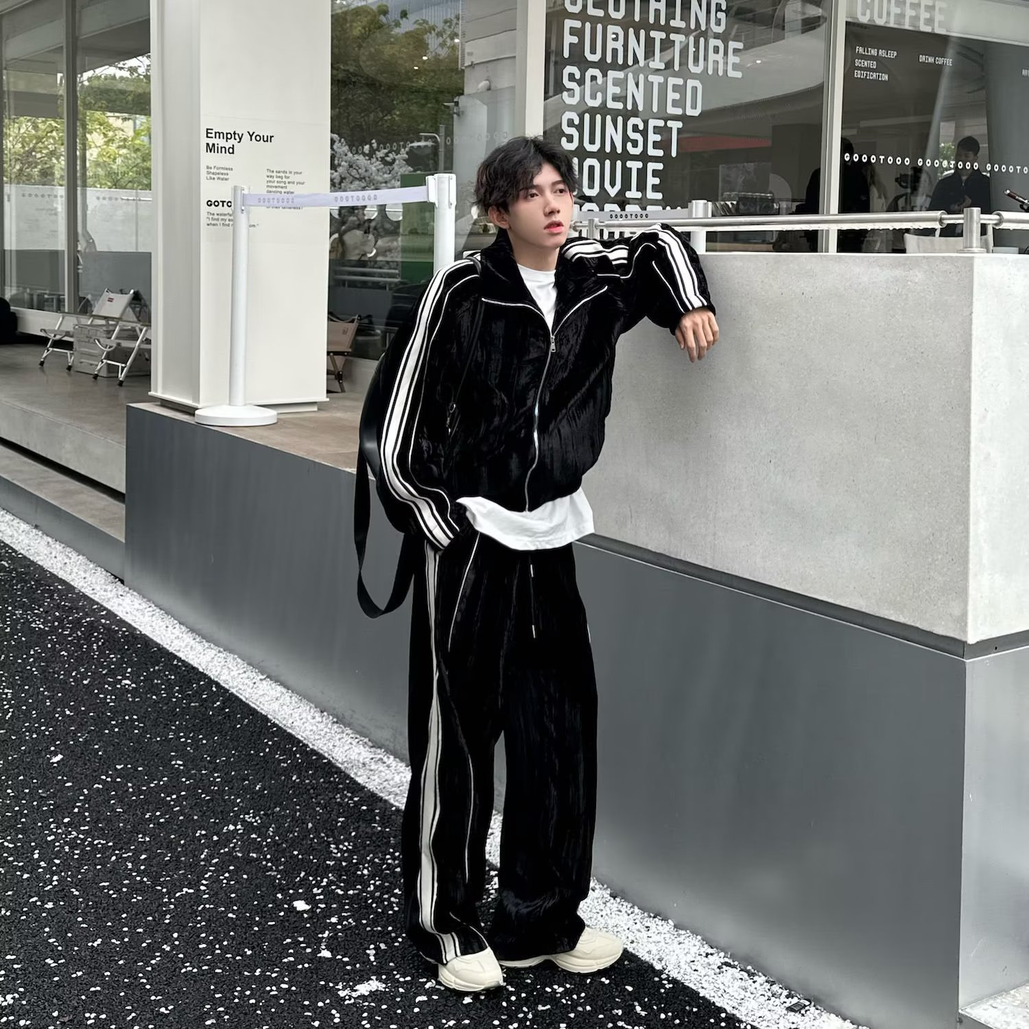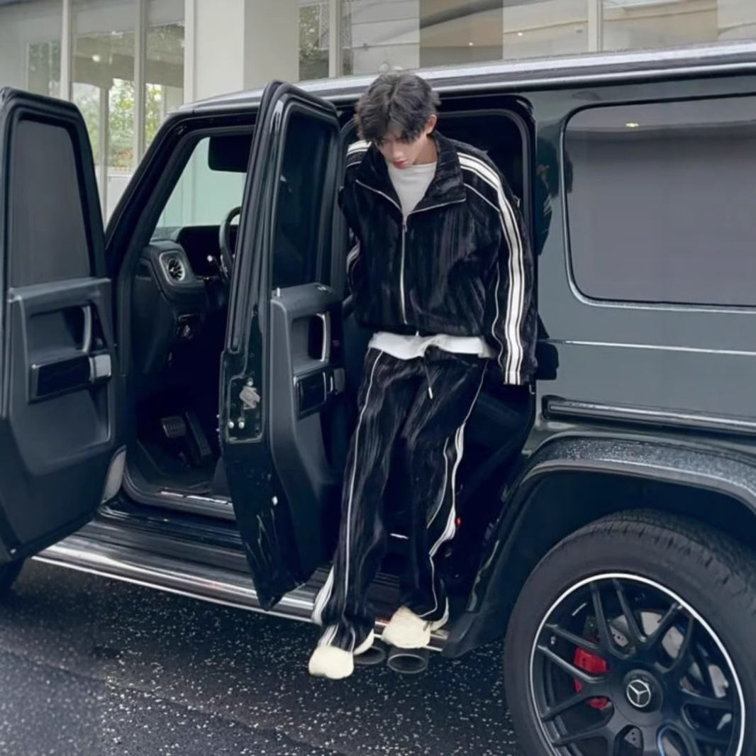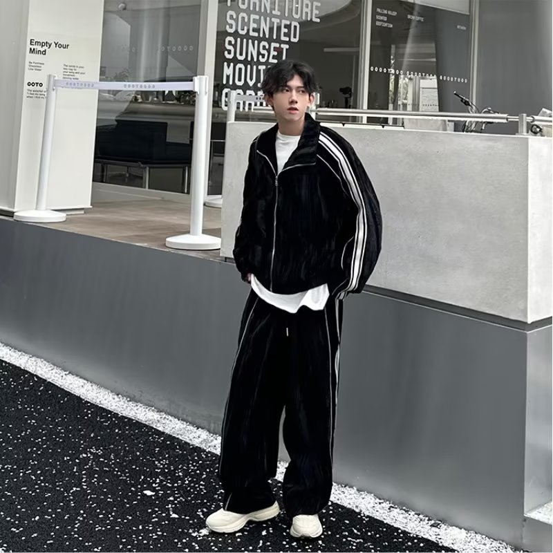 스포츠 세트 남자 레트로 미국 무거운 스웨터 봄과 가을 카디건 재킷 줄무늬 스웨터 트렌디 브랜드 세트