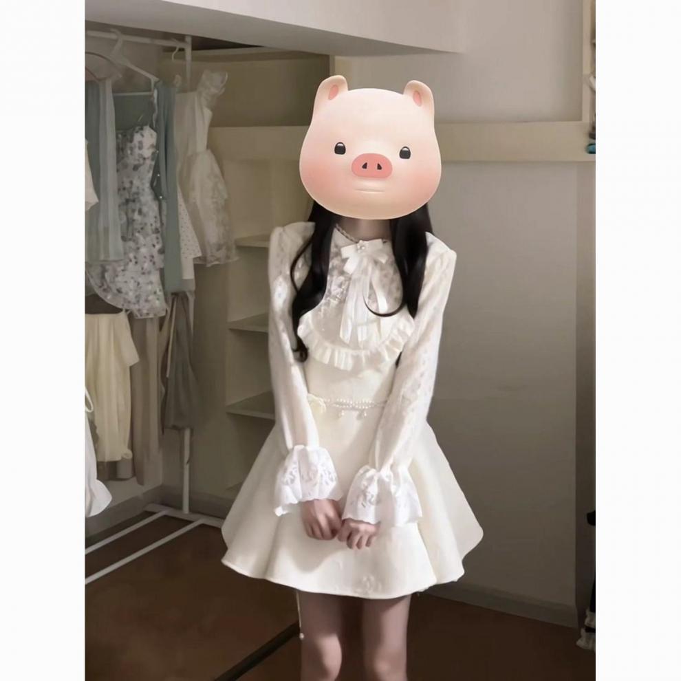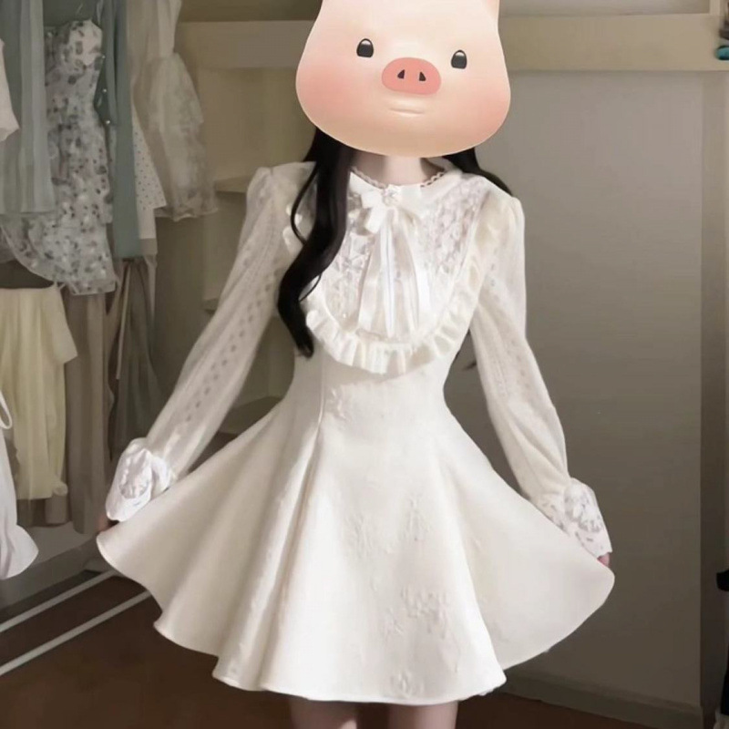 풍부한 가족 딸 작은 향기로운 스타일 원피스 여성의 가을과 겨울 디자인 스티칭 레이스 공주 원피스 헵번 허리 스커트