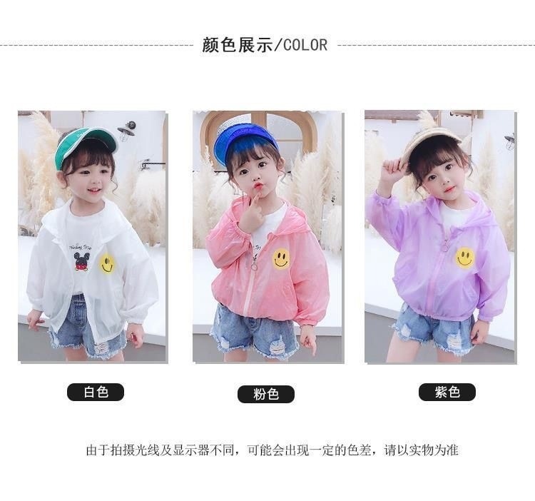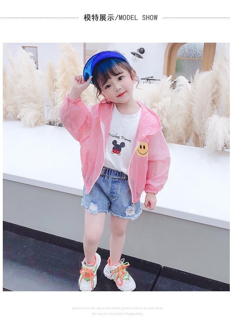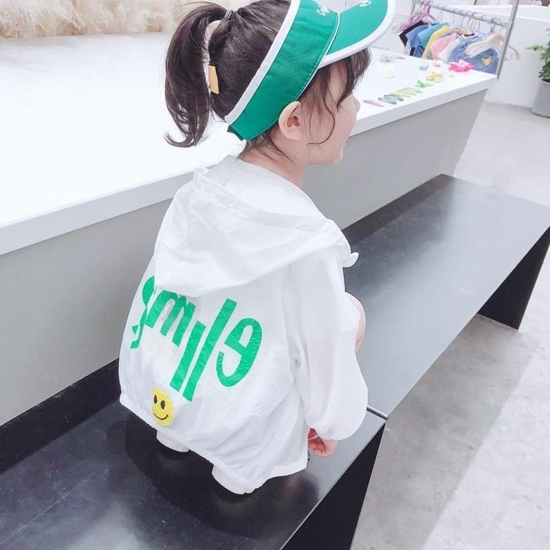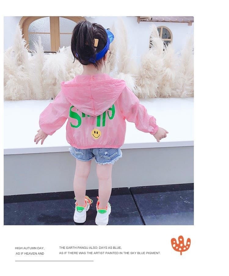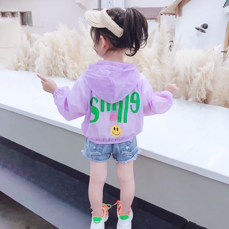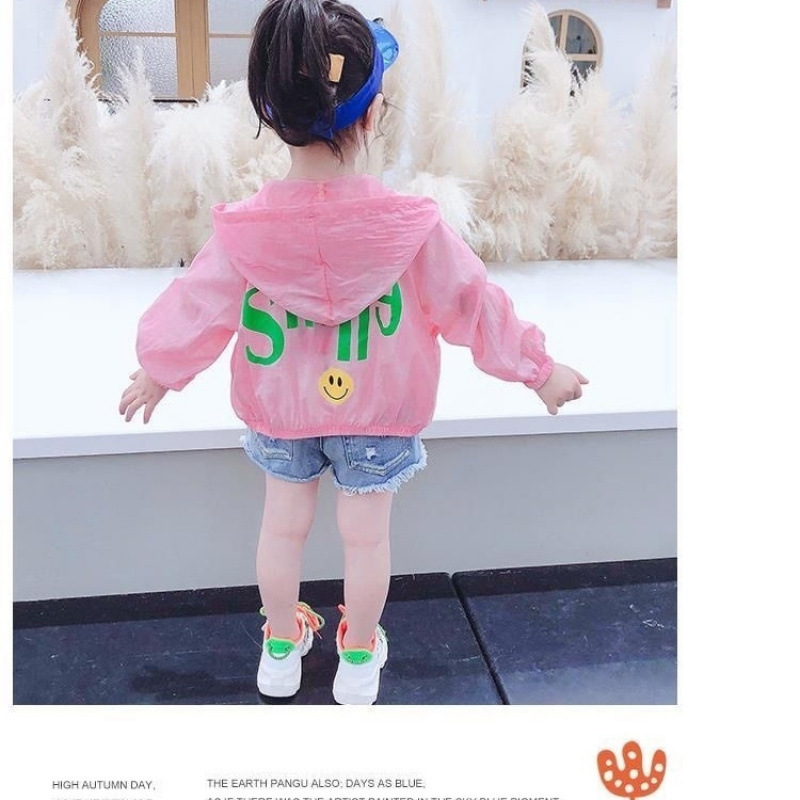 소녀의 선 스크린 의류 여름 얇은 어린이 노란색 웃는 코트 아기 소녀의 여름 옷 어린 소녀를위한 통기성 에어컨 옷스토어 가기