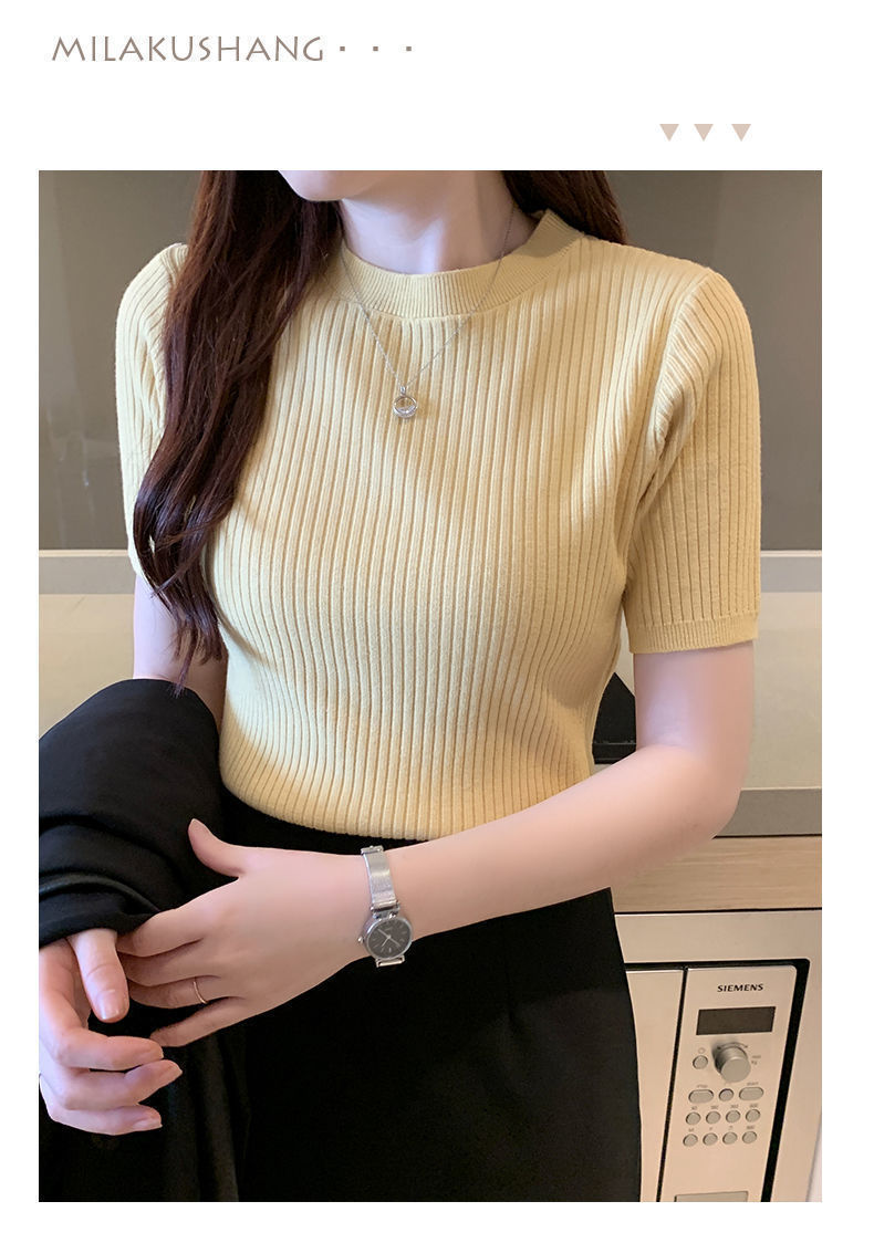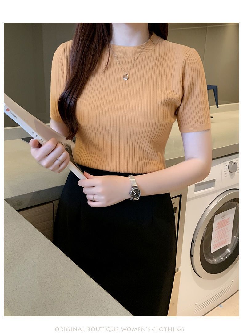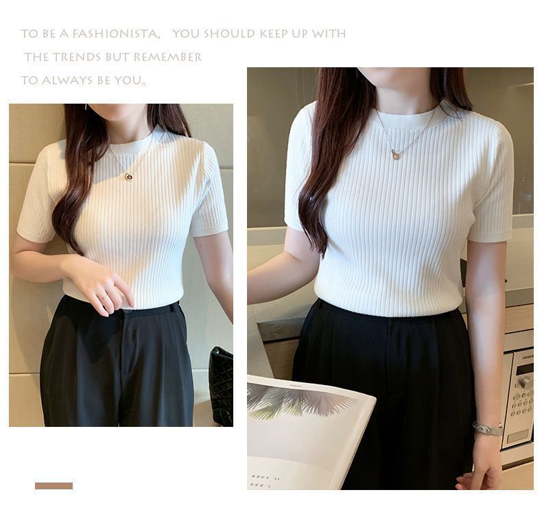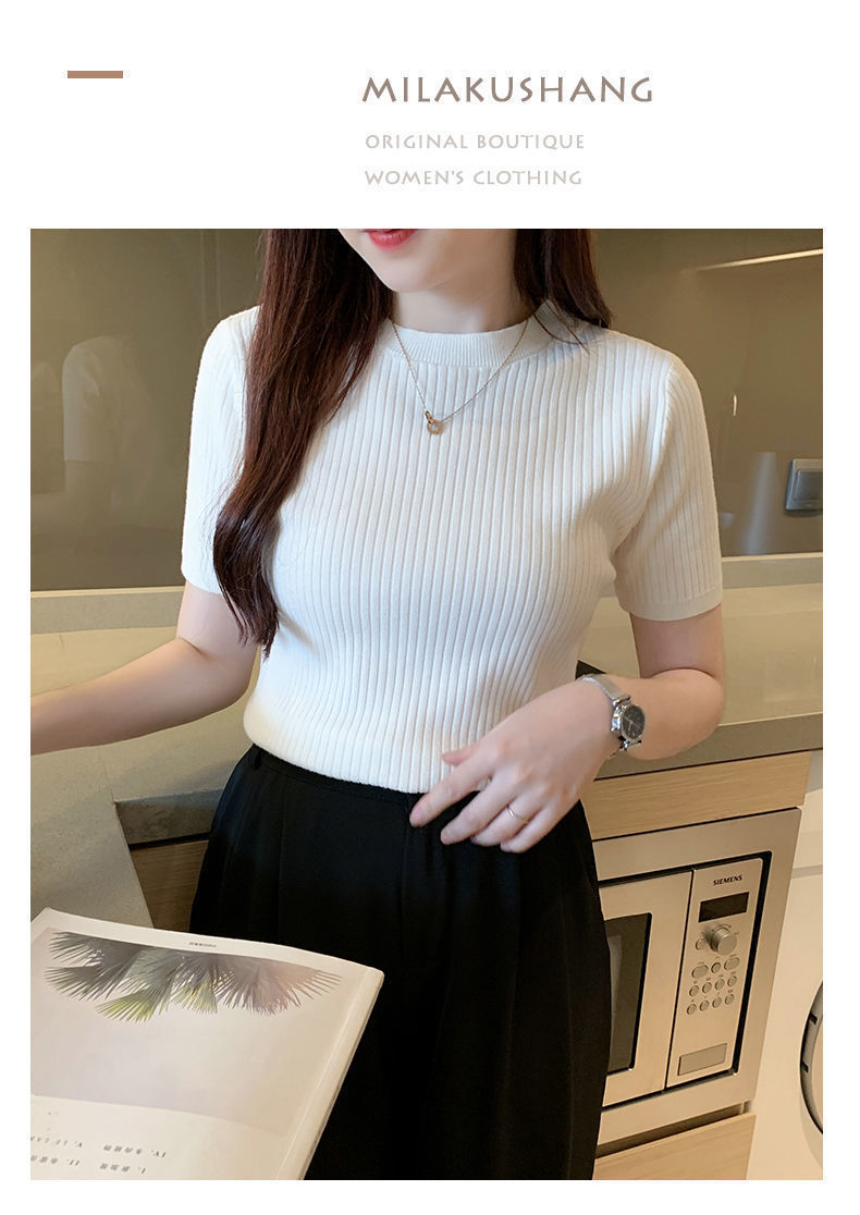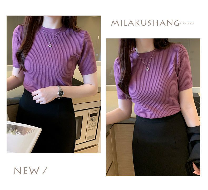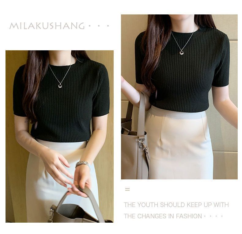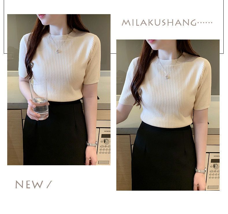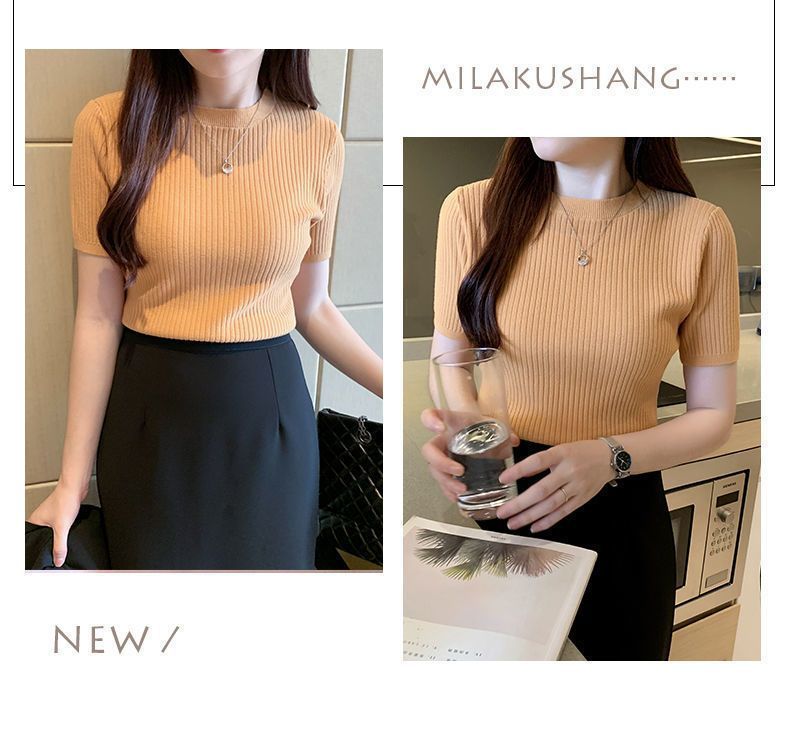 2025 새로운 한국식 여름 슬림 핏 스웨터 반팔 여성 풀오버 내부 짧은 라운드 넥베이스 셔츠스토어 가기