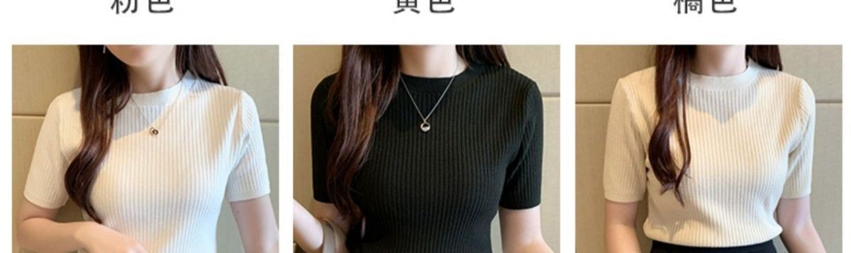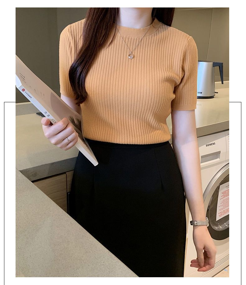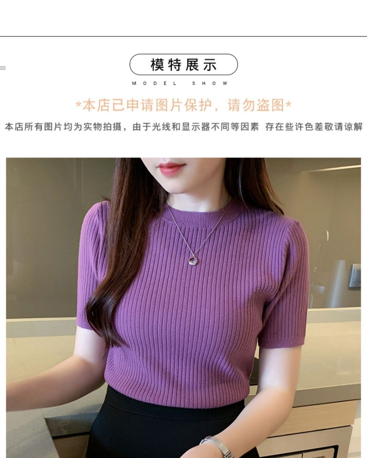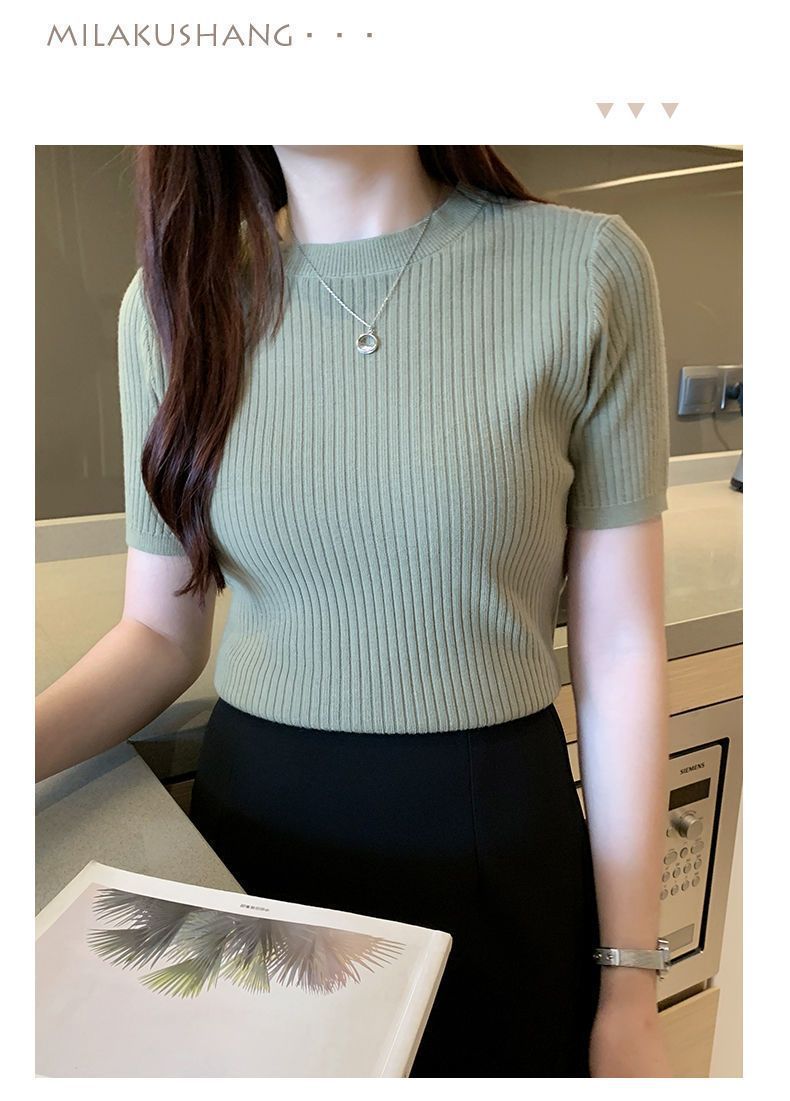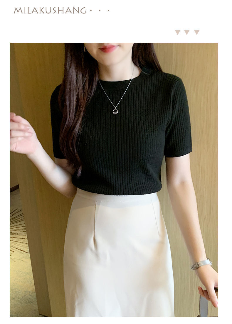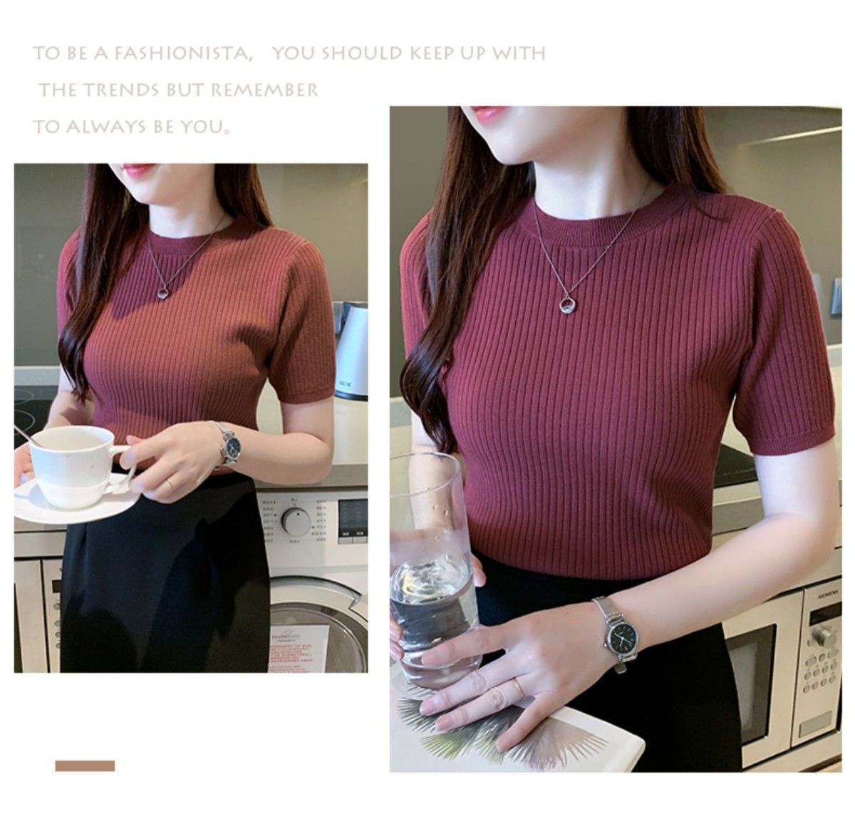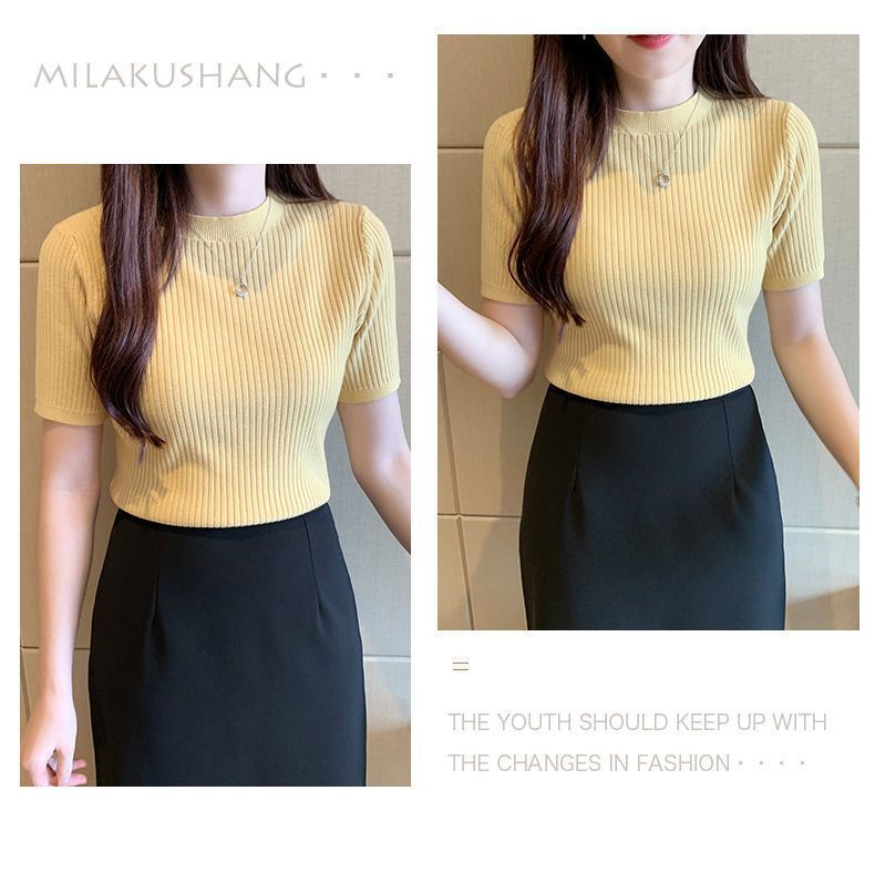 2025 새로운 한국식 여름 슬림 핏 스웨터 반팔 여성 풀오버 내부 짧은 라운드 넥베이스 셔츠스토어 가기