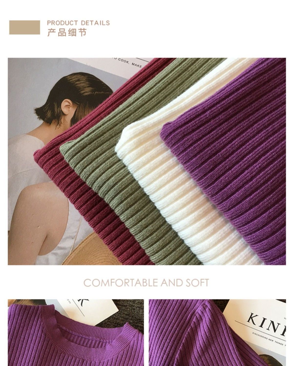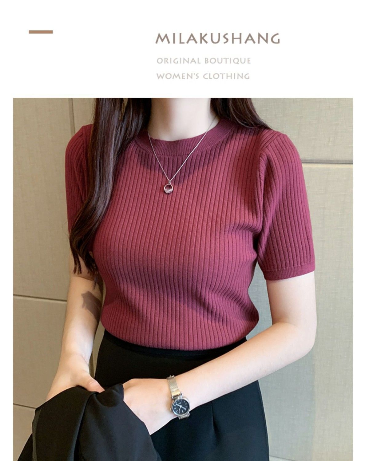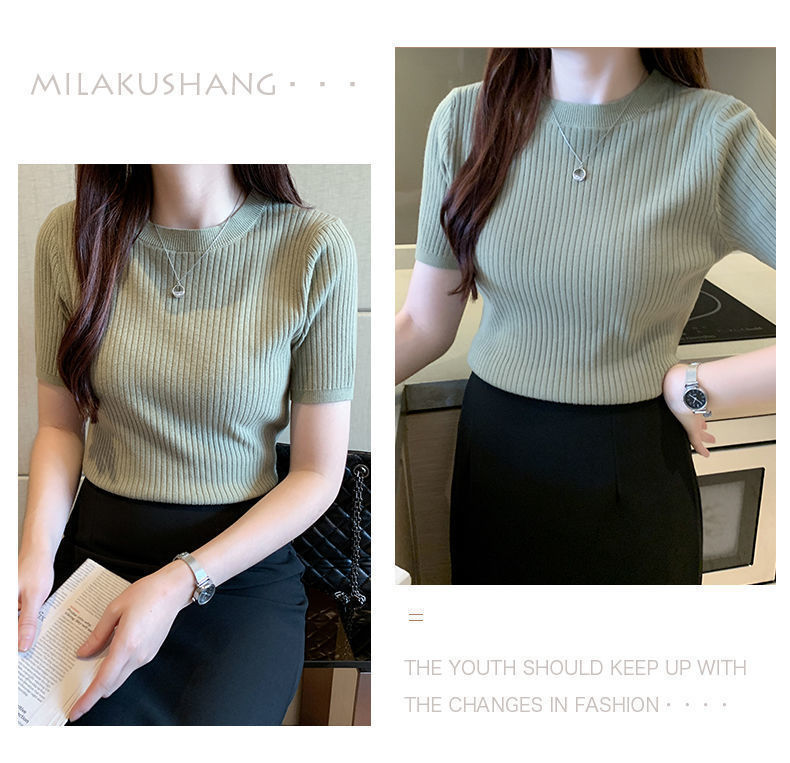 2025 새로운 한국식 여름 슬림 핏 스웨터 반팔 여성 풀오버 내부 짧은 라운드 넥베이스 셔츠