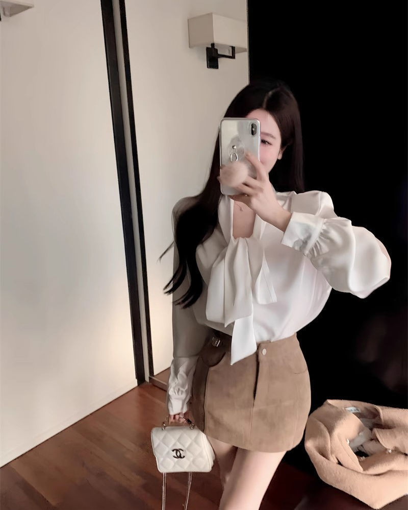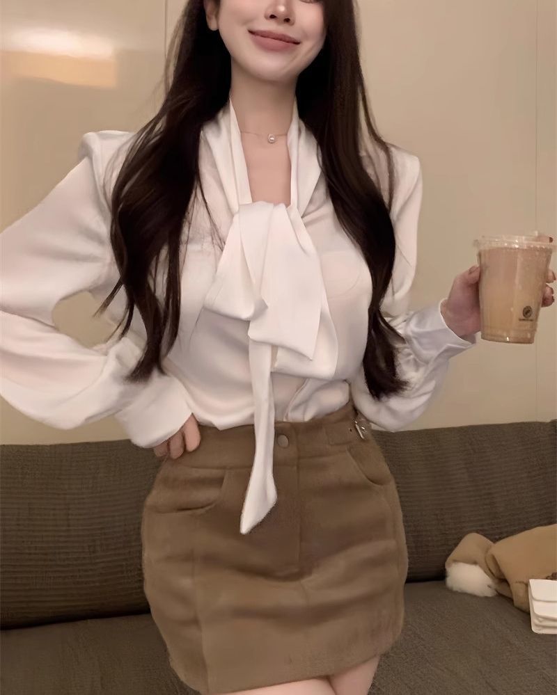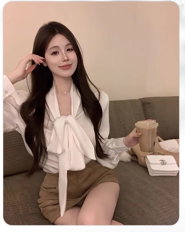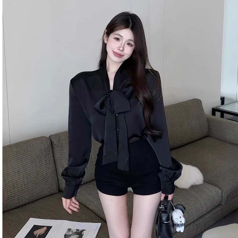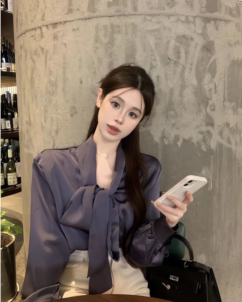 프랑스 스타일의 부드러운 스타일 우아한 새틴 어깨 패드 긴 소매 셔츠 여성의 가을과 겨울 화이트 디자인 감각스토어 가기