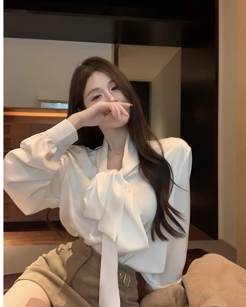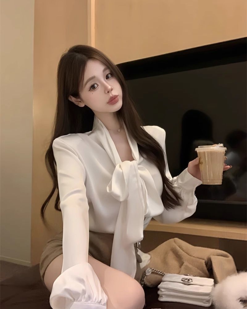 프랑스 스타일의 부드러운 스타일 우아한 새틴 어깨 패드 긴 소매 셔츠 여성의 가을과 겨울 화이트 디자인 감각