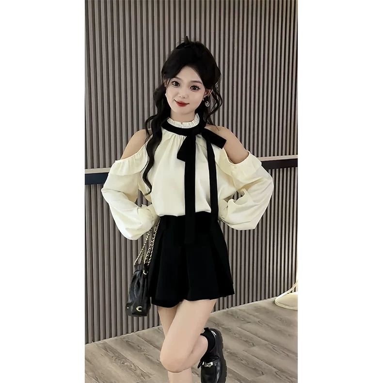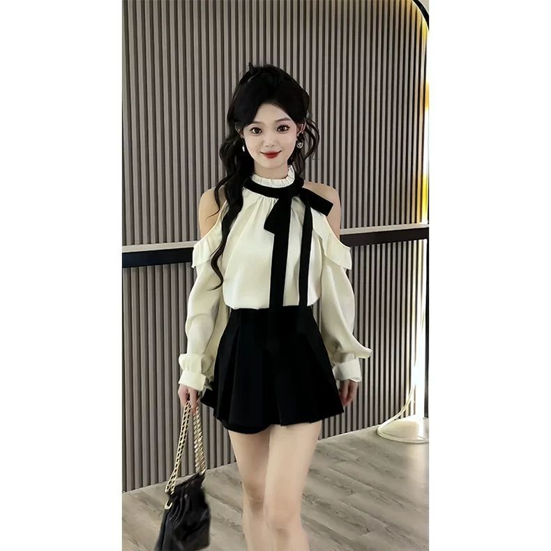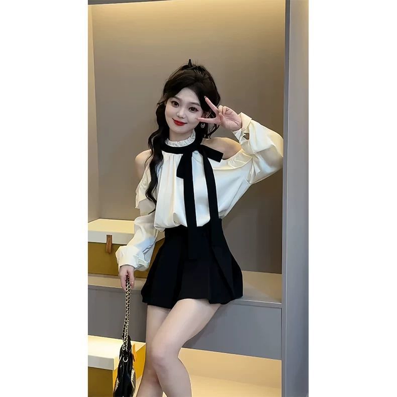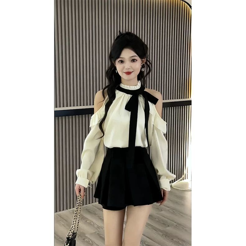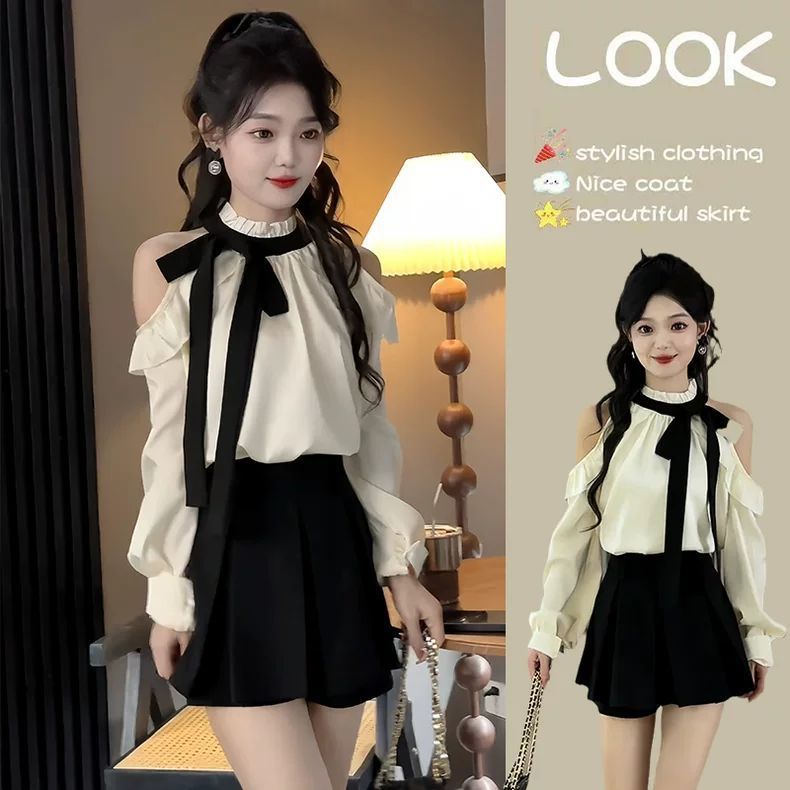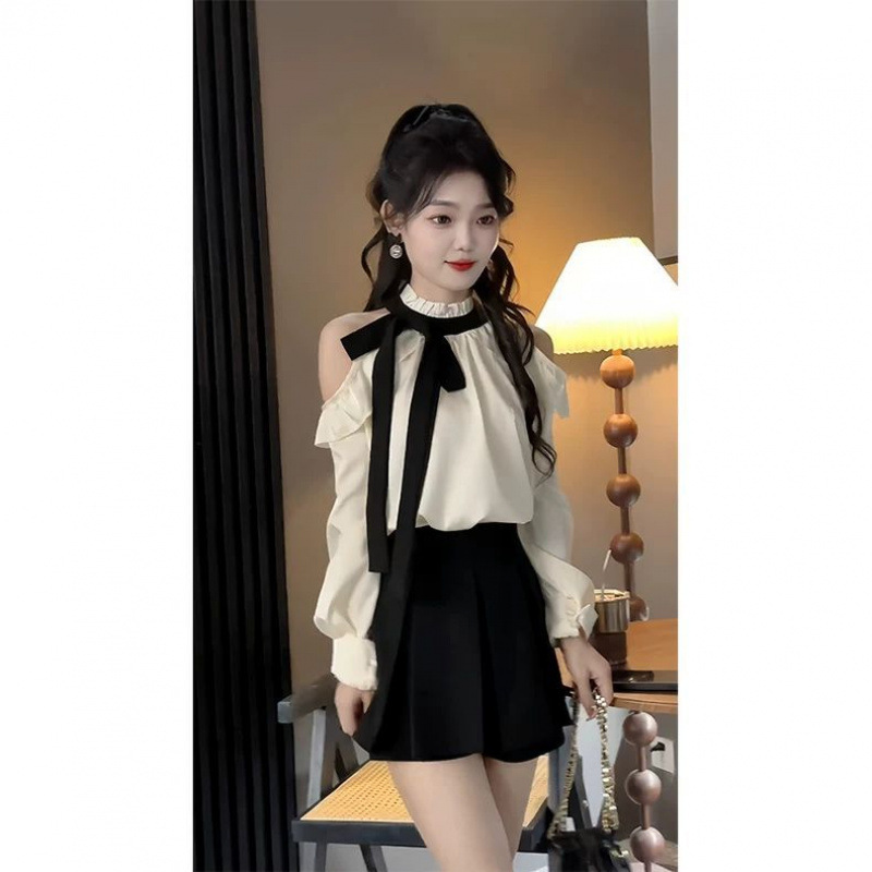여성을위한 오픈 숄더가있는 프랑스 달콤한 목 긴팔 셔츠 2025 가을 우아한 디자인