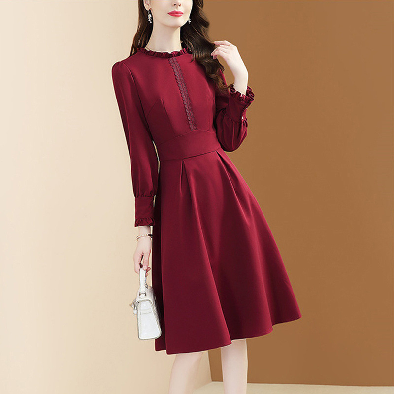 패션 귀 칼라 초기 빨간 긴 소매 스티칭 원피스 여성의 가을 2025 새로운 우아한 슬림 핏 슬림 원피스스토어 가기