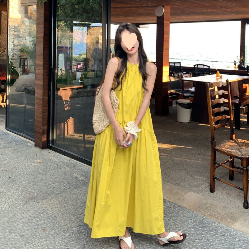 노란색 민소매 목 원피스 여름 여성의 2025 새로운 휴일 스타일 느슨한 우아한 복고풍 긴 원피스스토어 가기