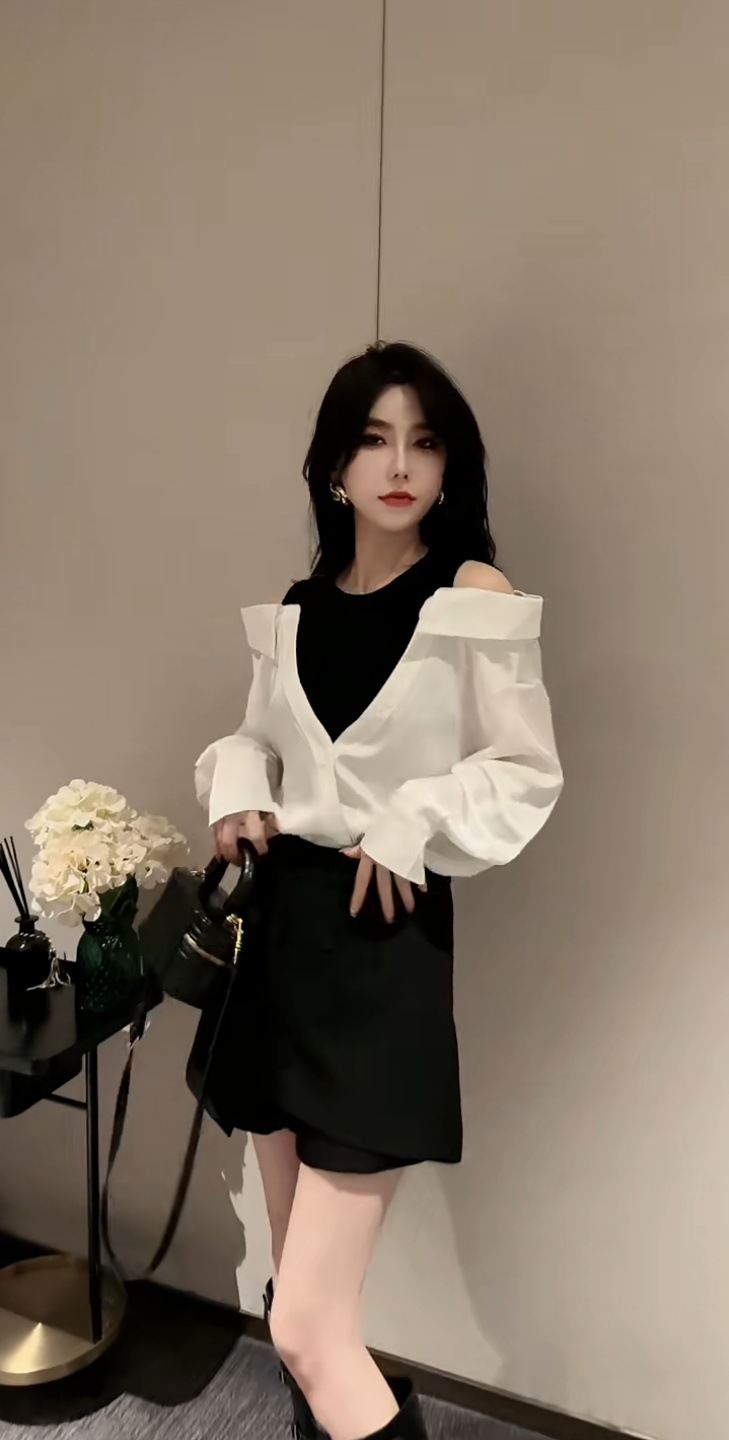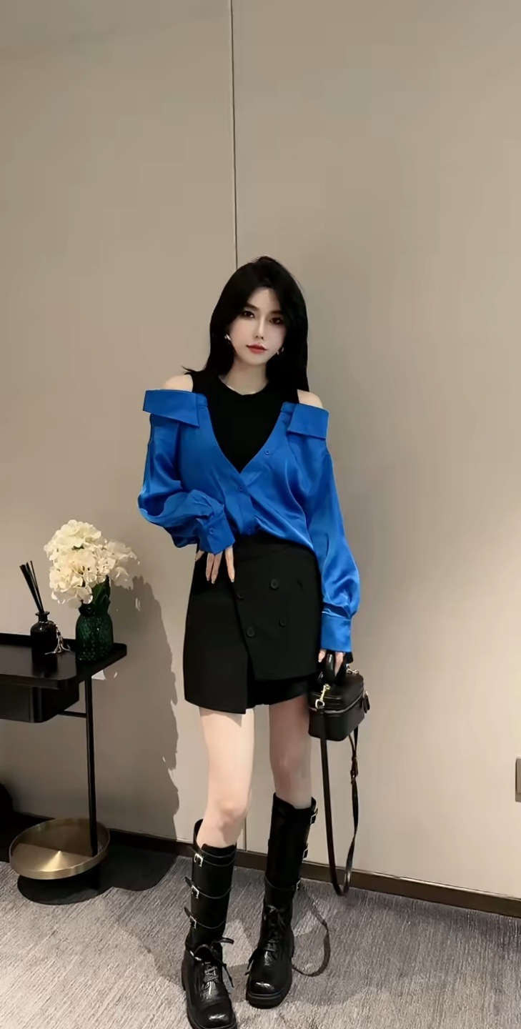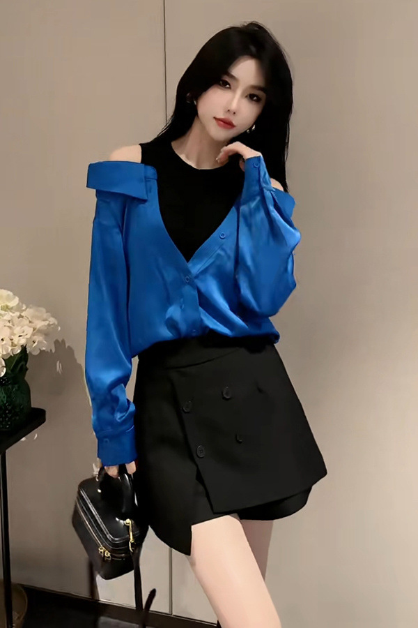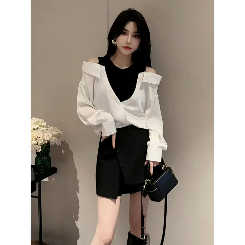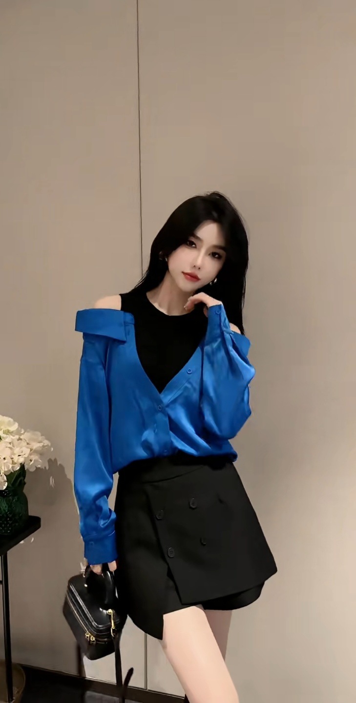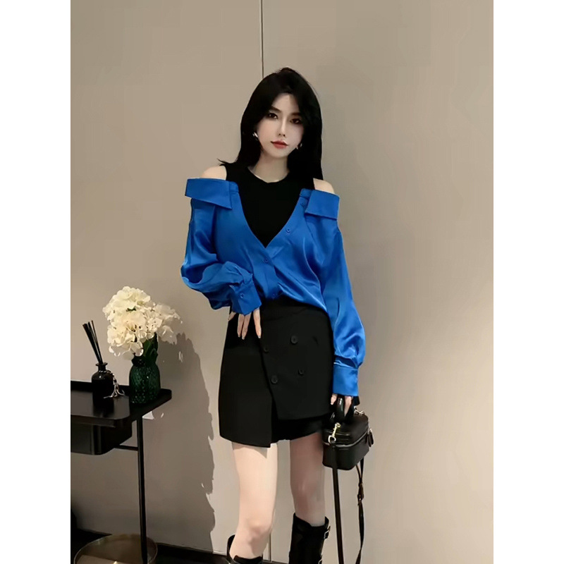 가을 2025 새로운 입장 빛 럭셔리 새틴 바느질 가짜 투피스 셔츠 유행 어깨 느슨한스토어 가기