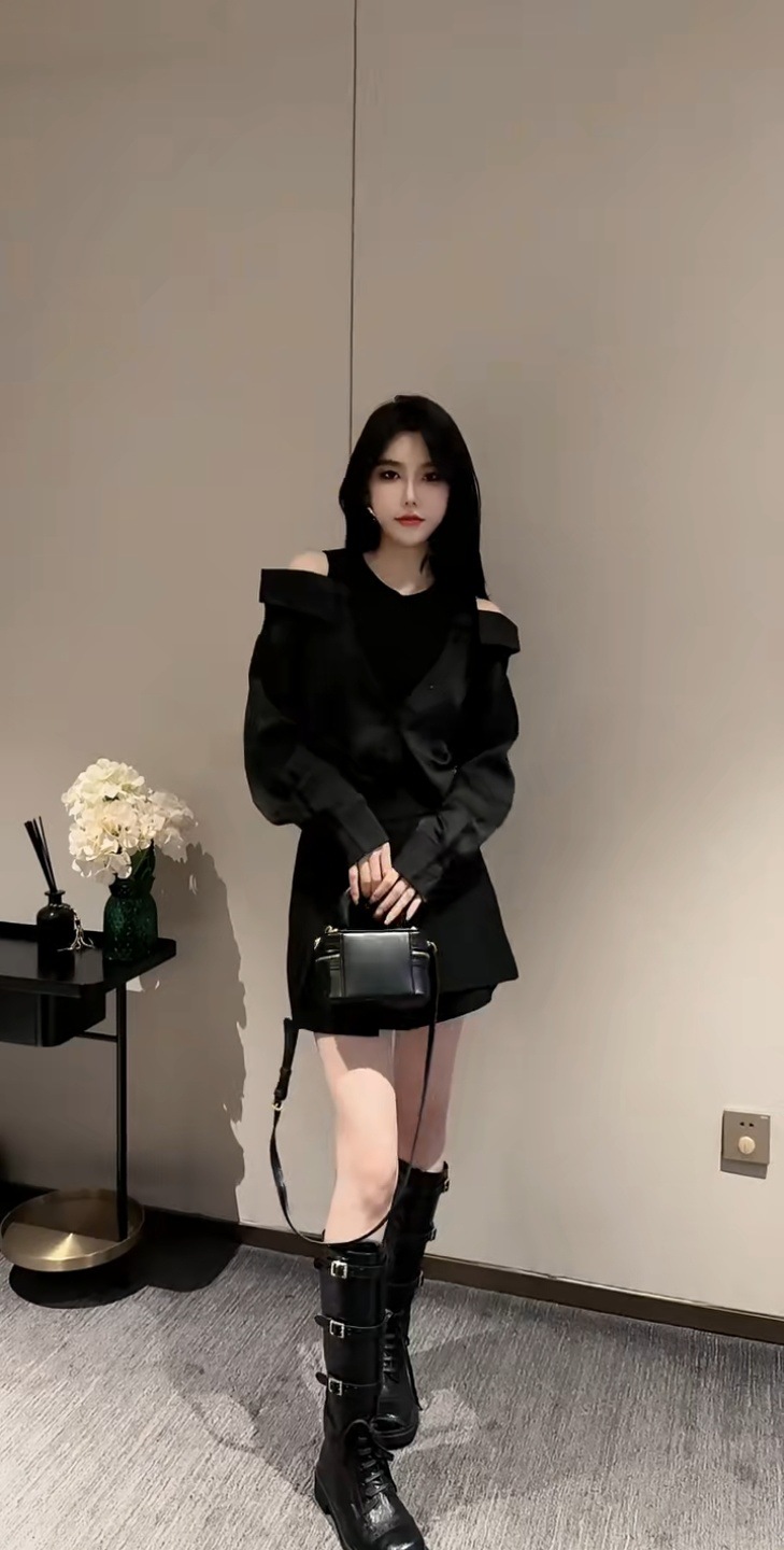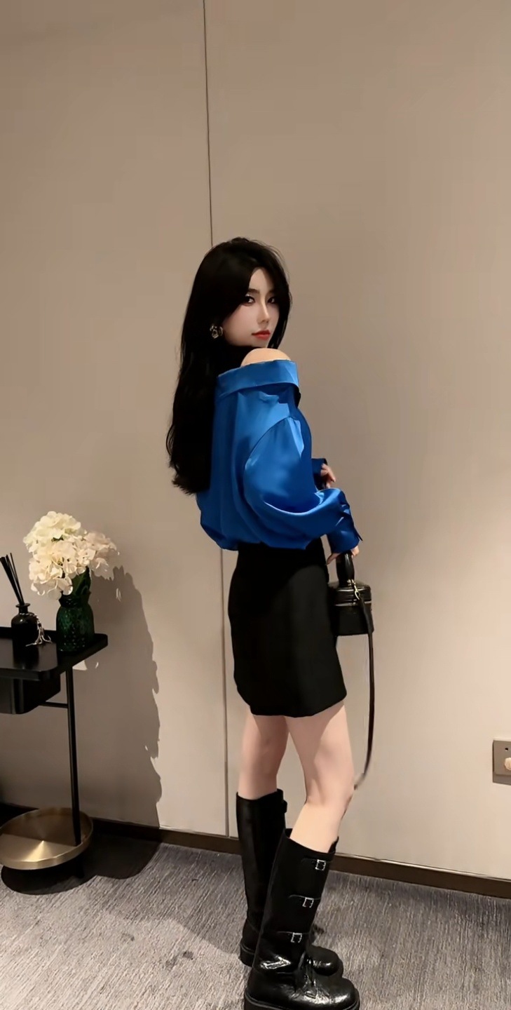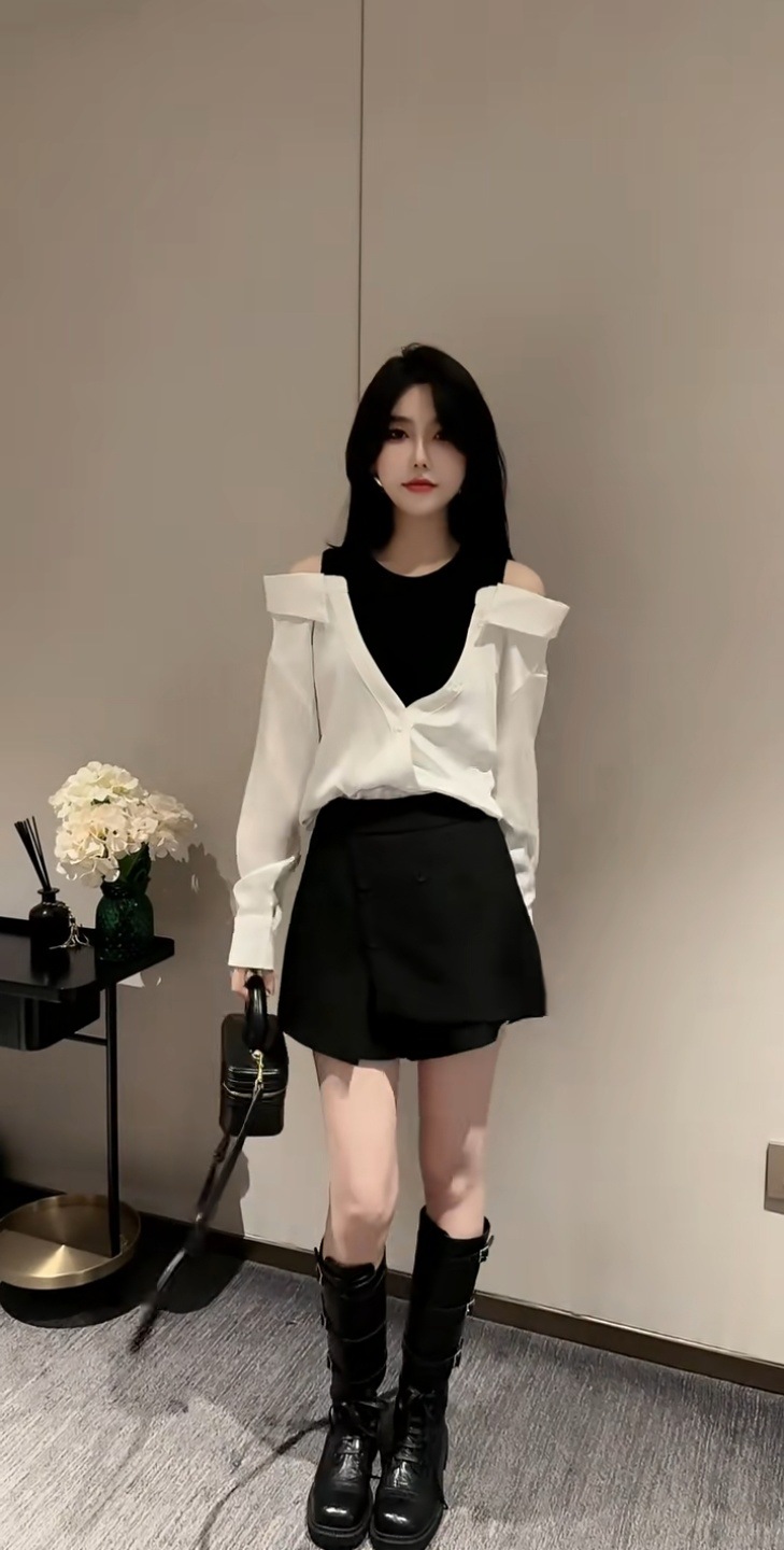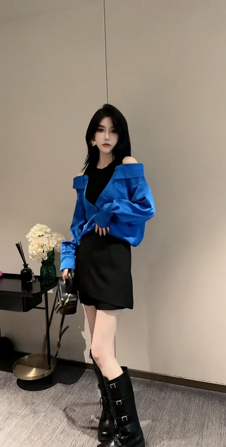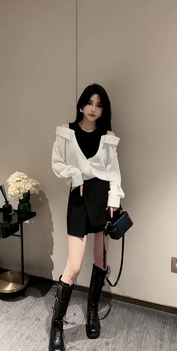 가을 2025 새로운 입장 빛 럭셔리 새틴 바느질 가짜 투피스 셔츠 유행 어깨 느슨한스토어 가기
