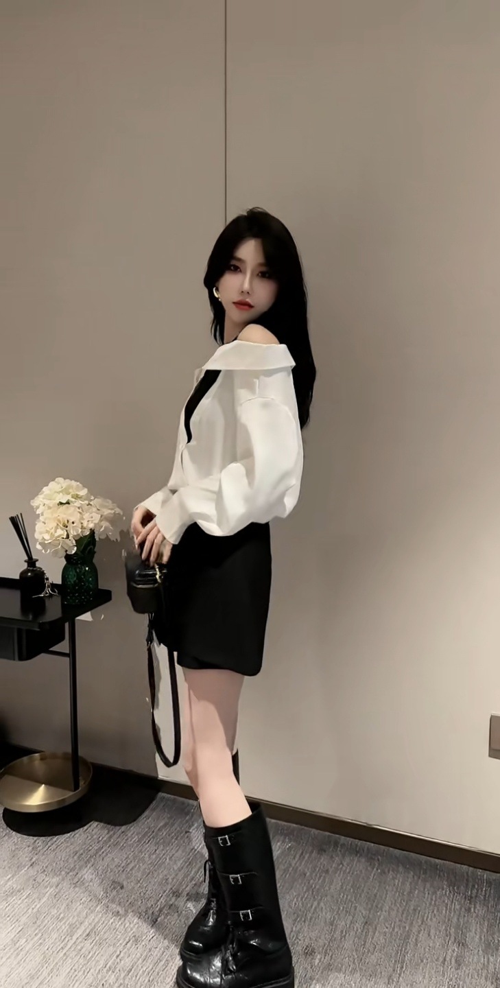 • 블랙 패치워크 페이크 투피스 셔츠