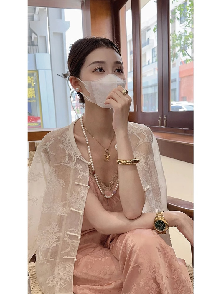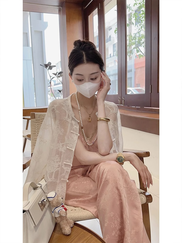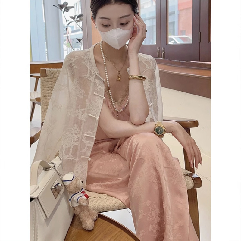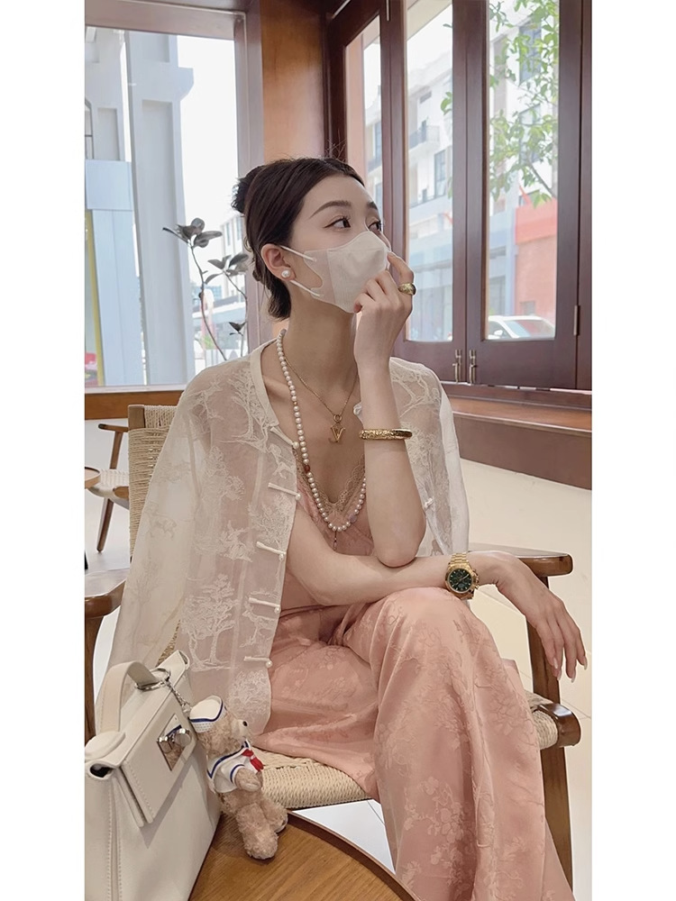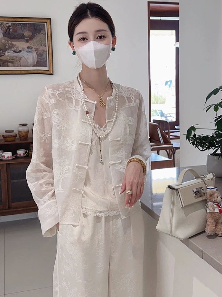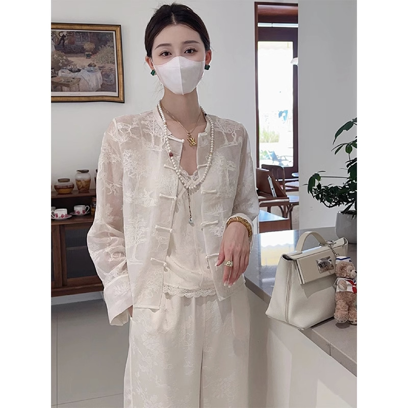 새로운 중국식 세트 여성 2023 여름 새로운 여성 하이 엔드 셔츠 슬링 탑 트렌디 한 3 피스 바지