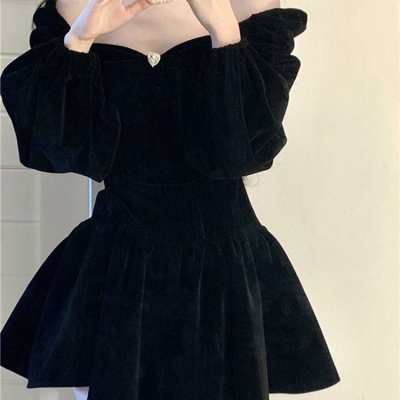 플러스 사이즈 블랙 헵번 스타일 벨벳 원피스 여성의 새로운 도착 고급 프렌치 스타일 스퀘어 칼라 타이트 허리 공주 캐노피 스커트
