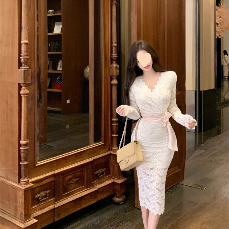 보라색 칼라 레이스 원피스 여성 가을 긴팔 슬림 핏 스트랩 중간 길이의 가벼운 성숙한 스타일 웨이스트 힙합 스커트