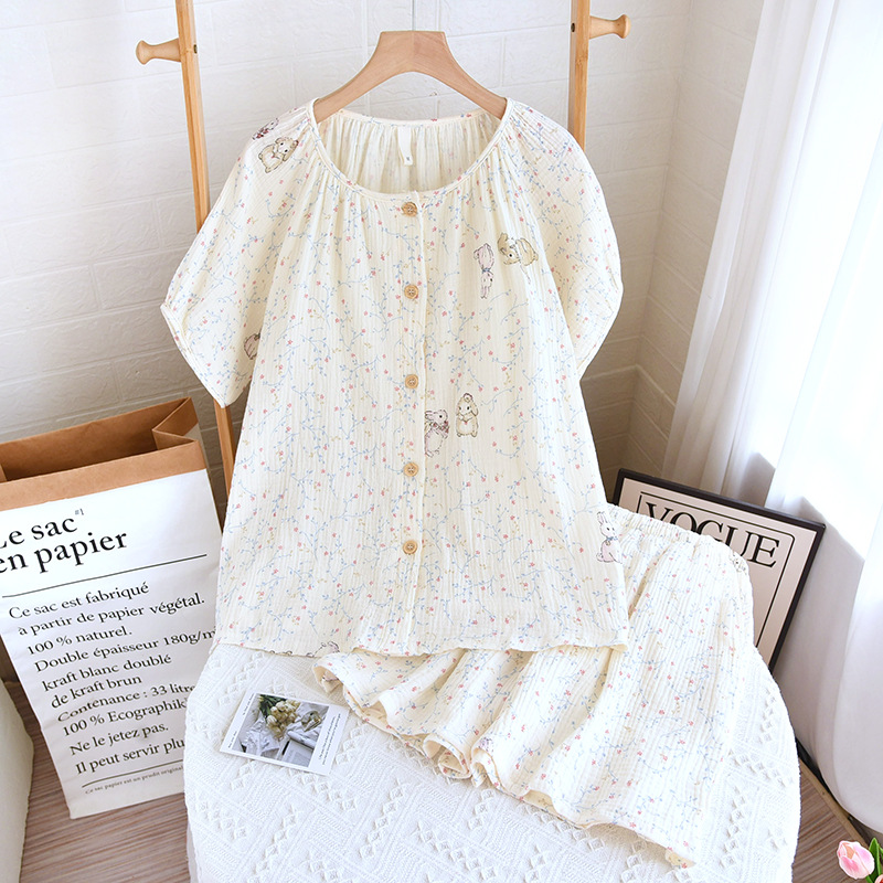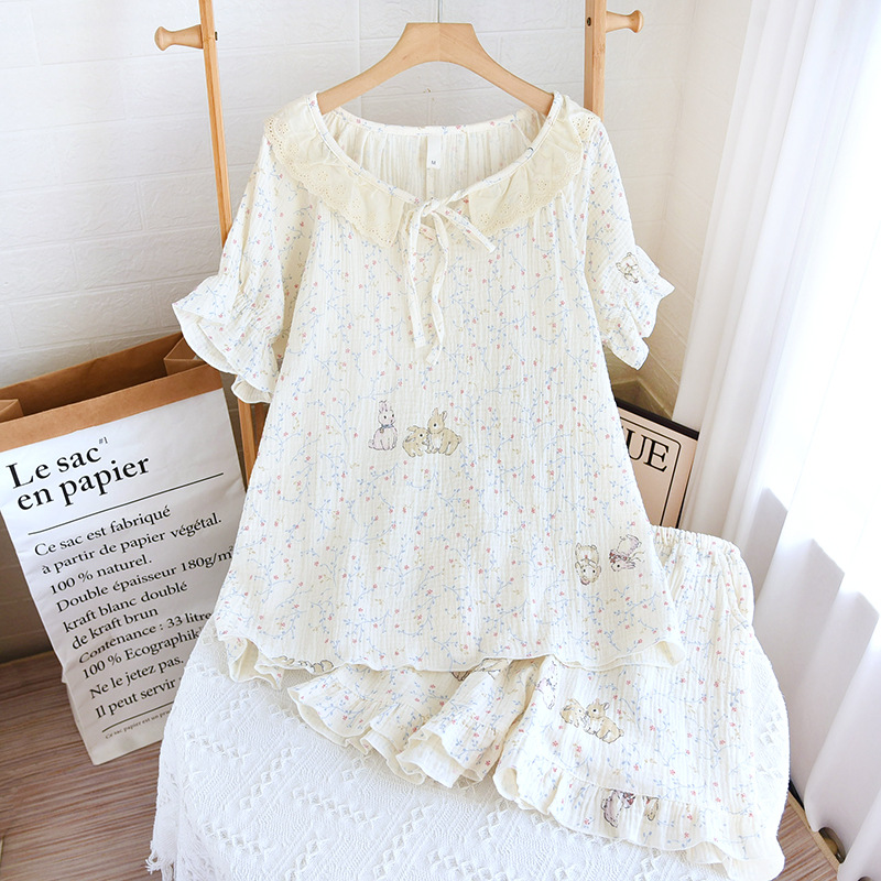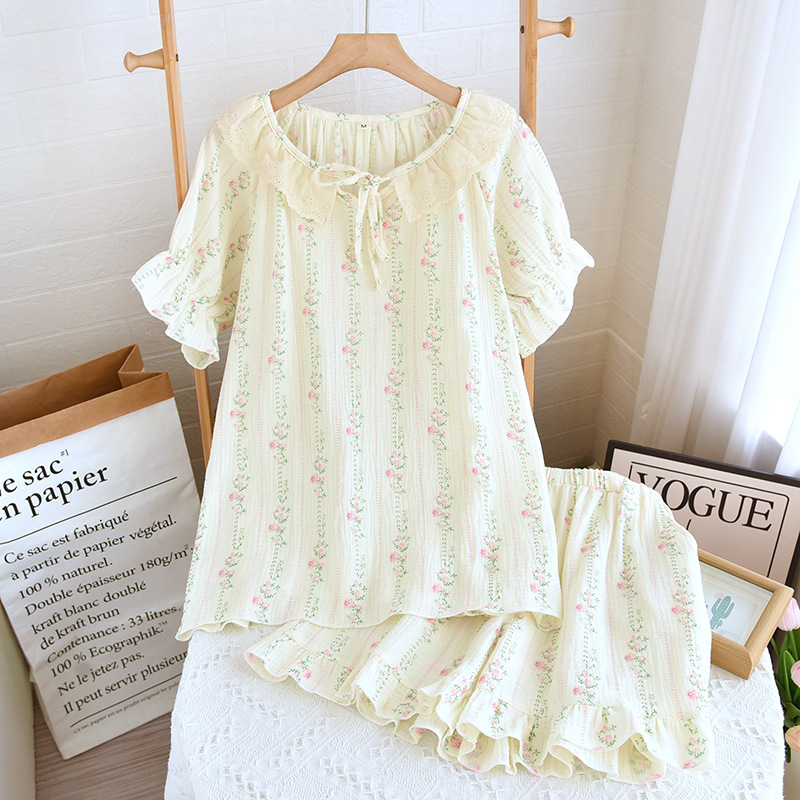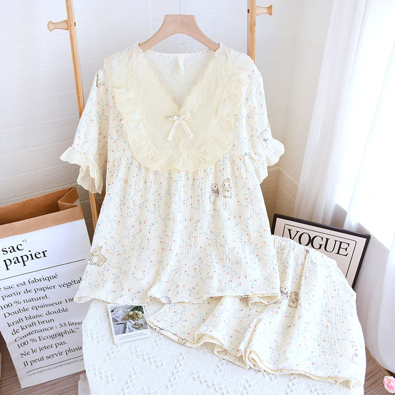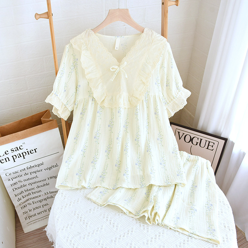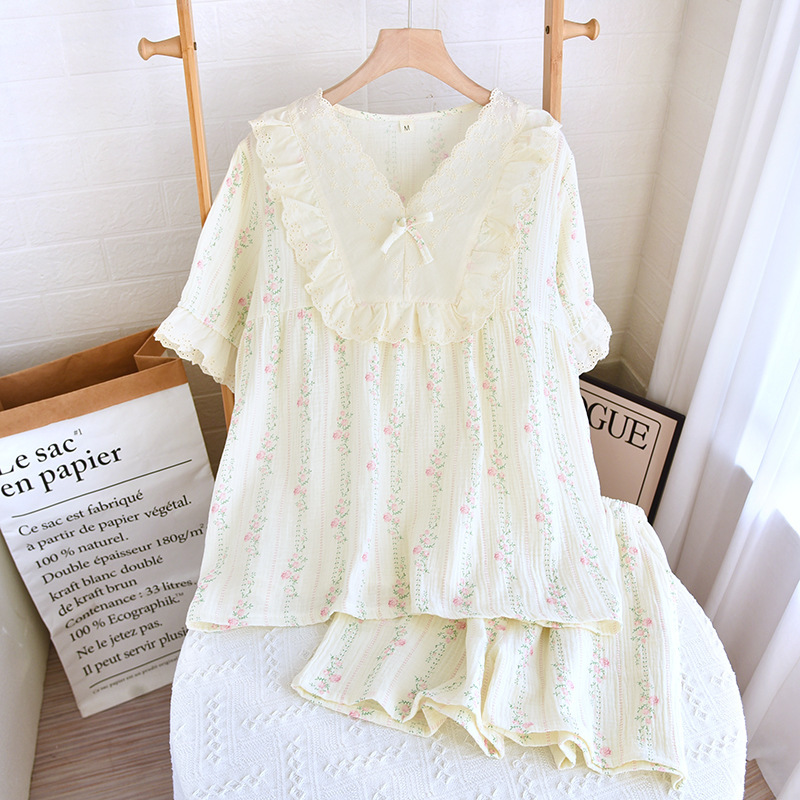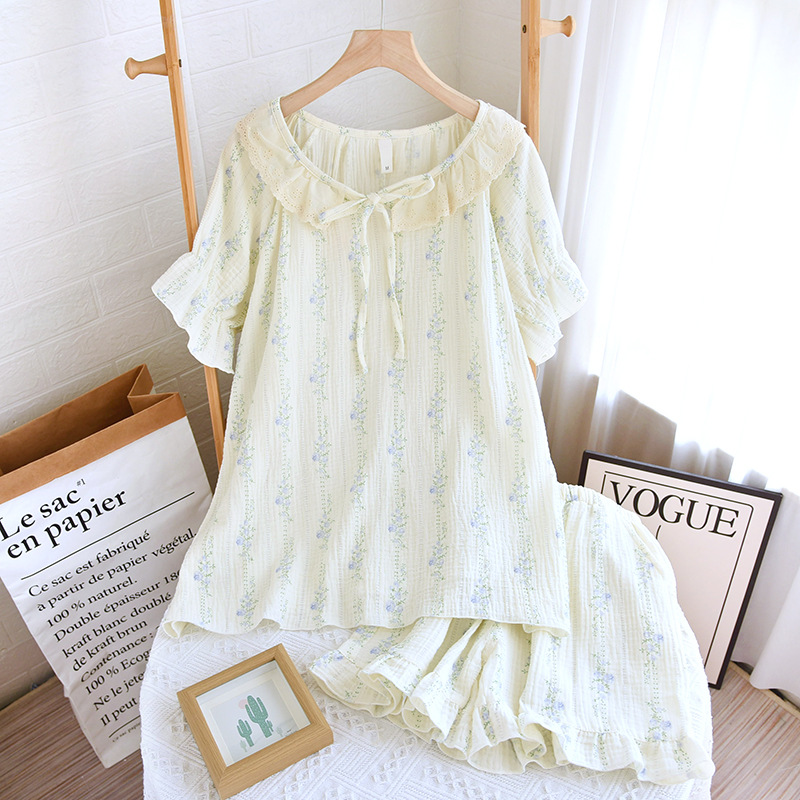 공주 스타일 둥근 목 풀오버 파자마 여성 여름 반바지 짧은 소매 얇은 면 더블 거즈 플러스 사이즈 세트 아우터웨어스토어 가기