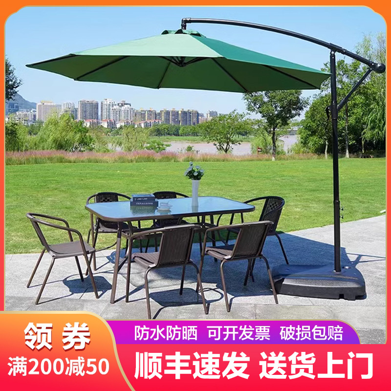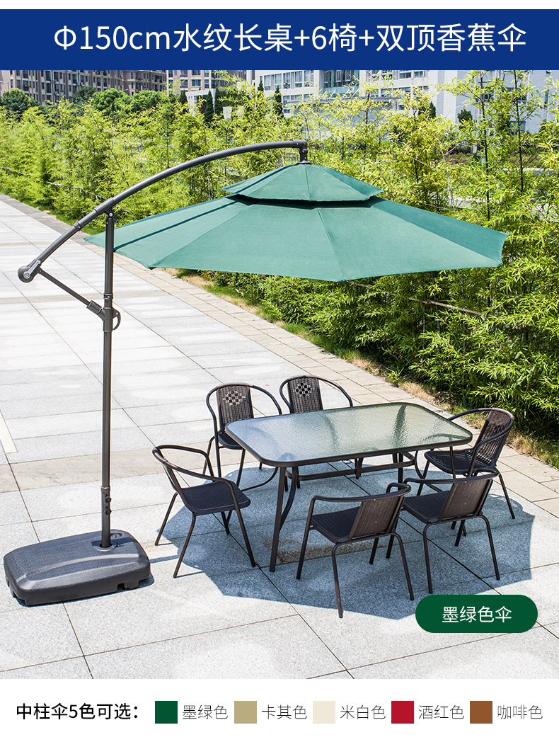 • 150*90 직사각형 테이블 + 의자 6개 + 이중 상단 중앙 기둥 우산