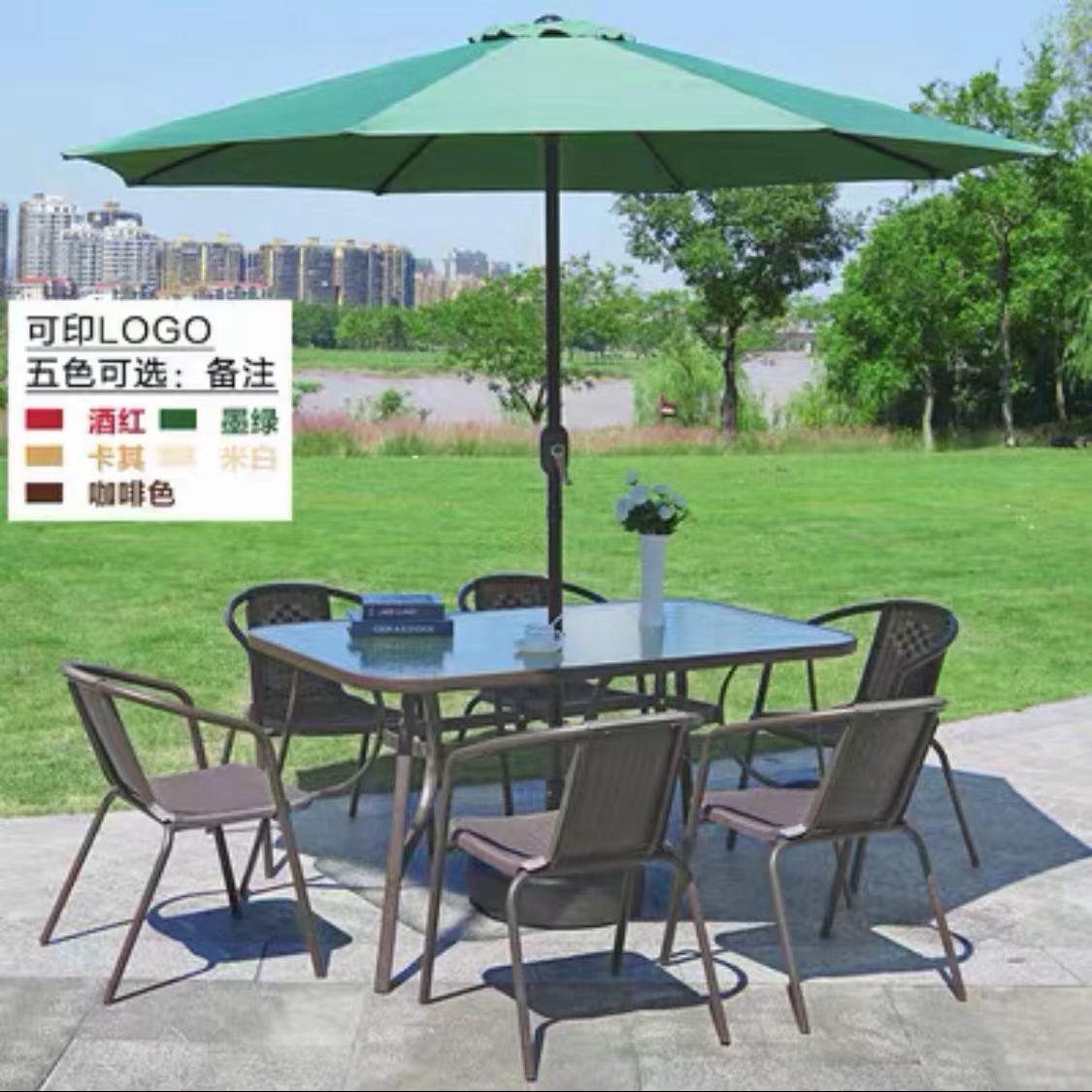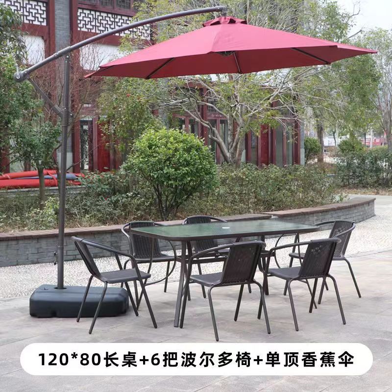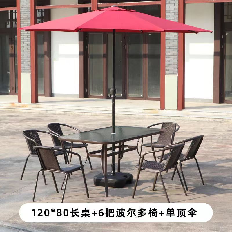 • 120*80 직사각형 테이블 + 의자 6개 + 단일 상단 중앙 기둥 우산