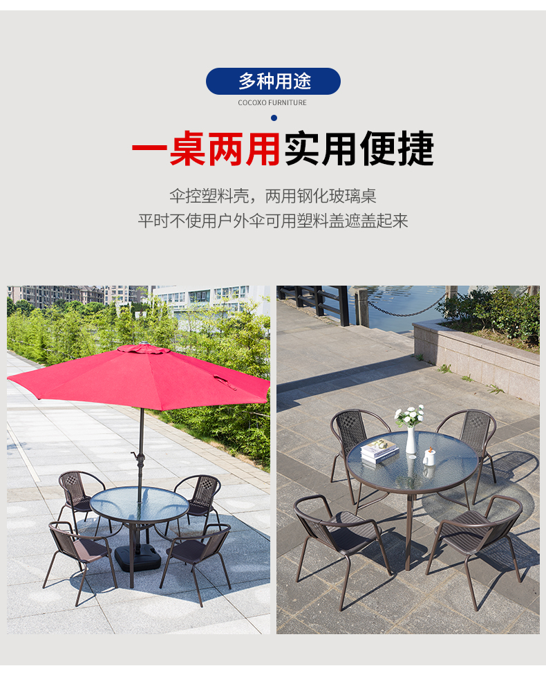 • 150*90 직사각형 테이블 + 의자 6개 + 단일 상단 중앙 기둥 우산
