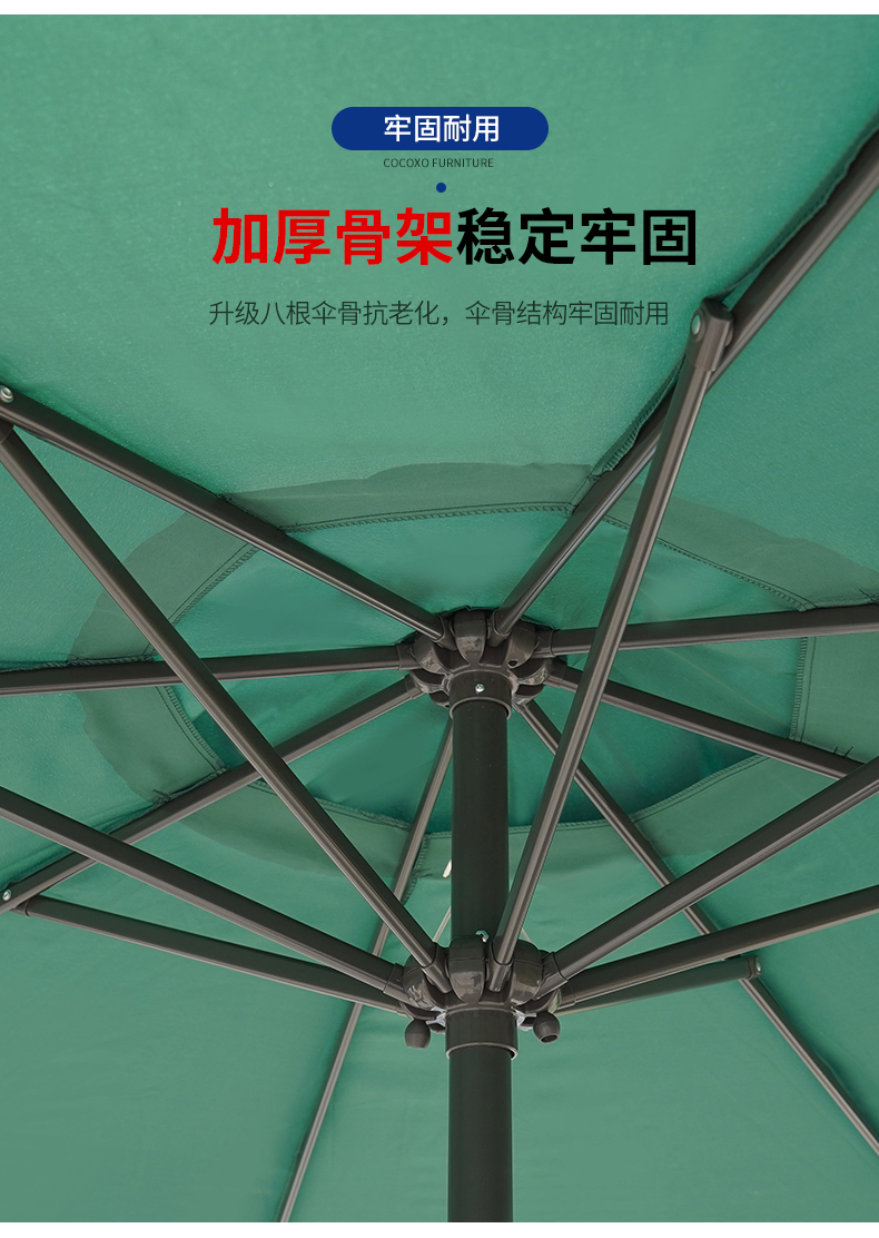 • 150*90 직사각형 테이블 + 의자 8개 + 이중 상단 중앙 기둥 우산