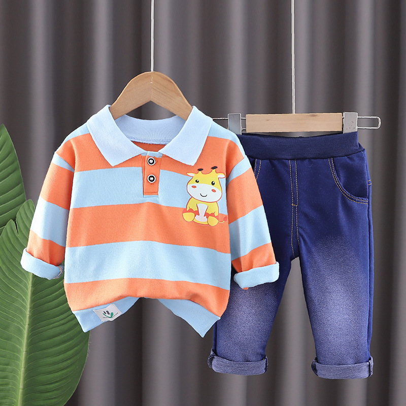 봄 세트 2025 봄과 가을 소년 어린이 새로운 어린이 서양식 줄무늬 사슴 옷깃 긴 소매 투피스 세트