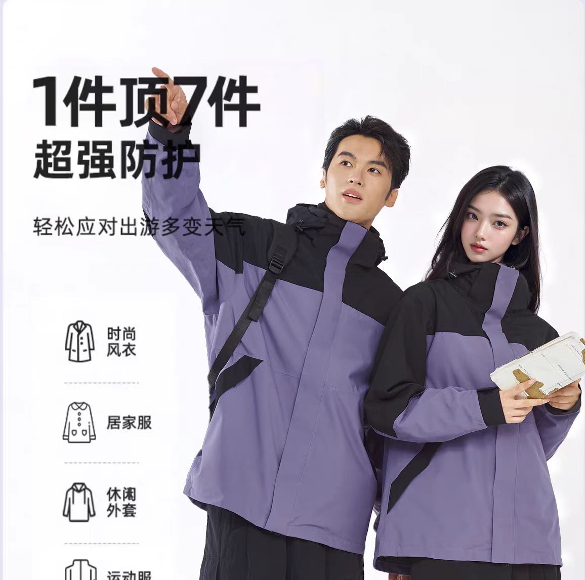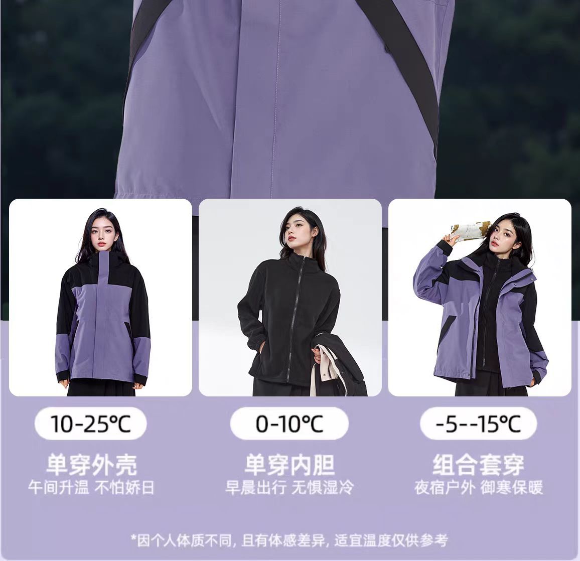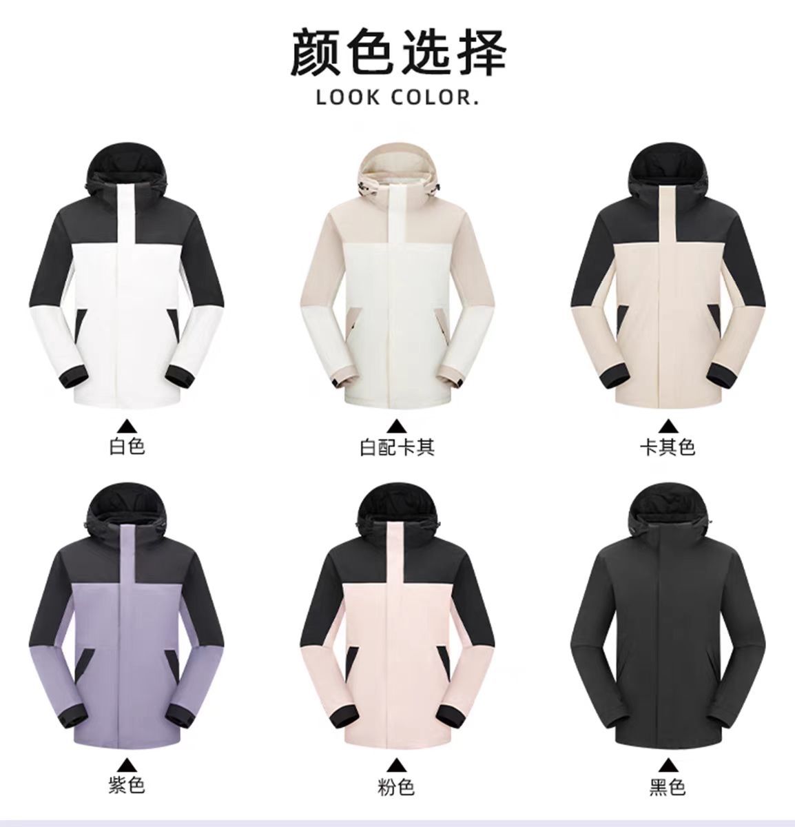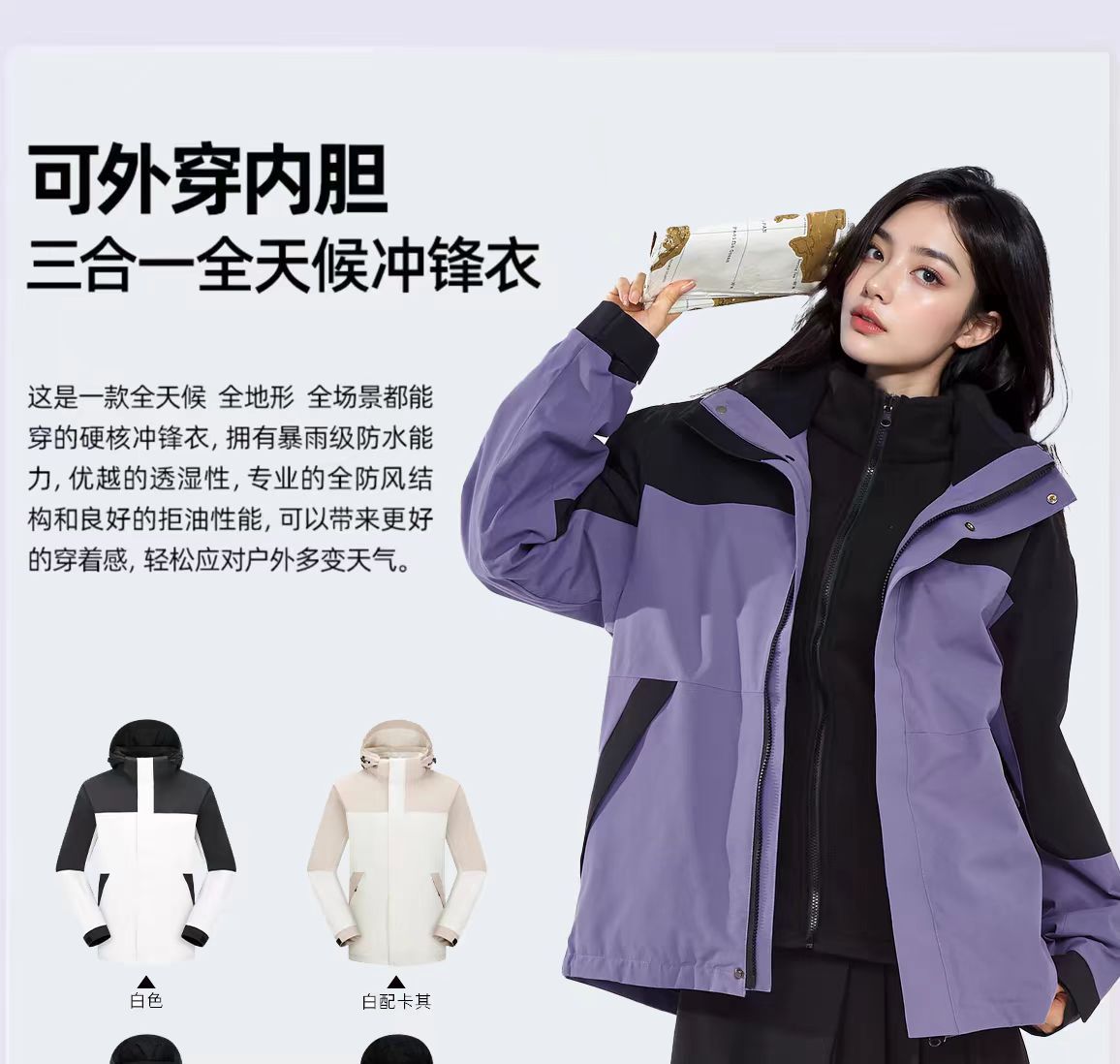 새로운 고무 프레스 재킷 3 대 1 탈착식 2 피스 방수 방풍 남성 및 여성 등산 세트 로고를 인쇄 할 수 있습니다.스토어 가기