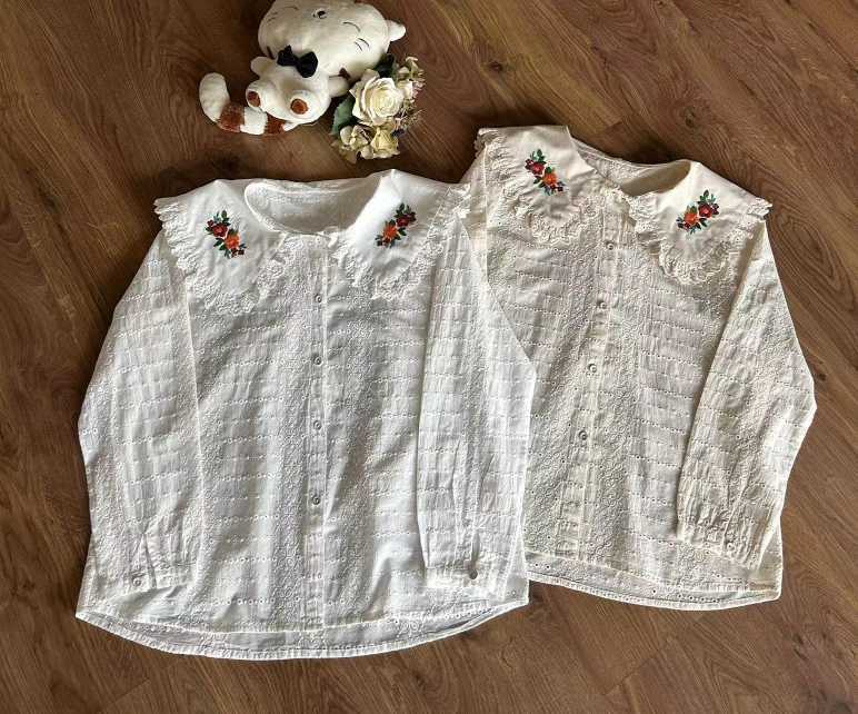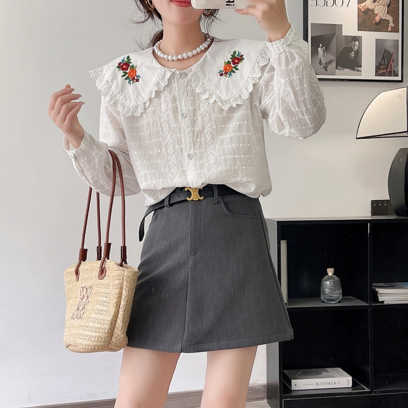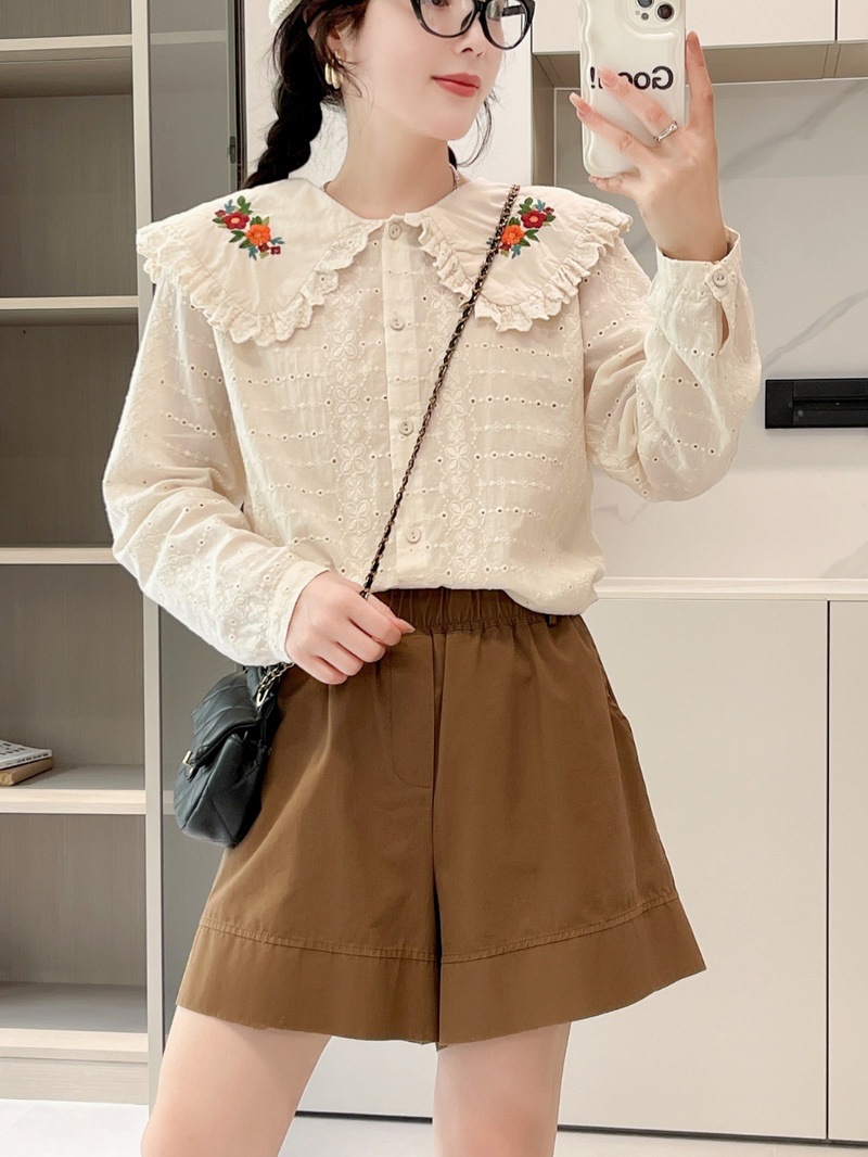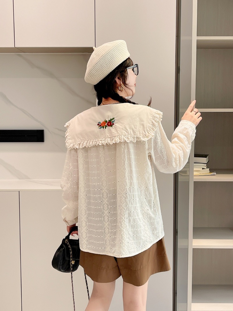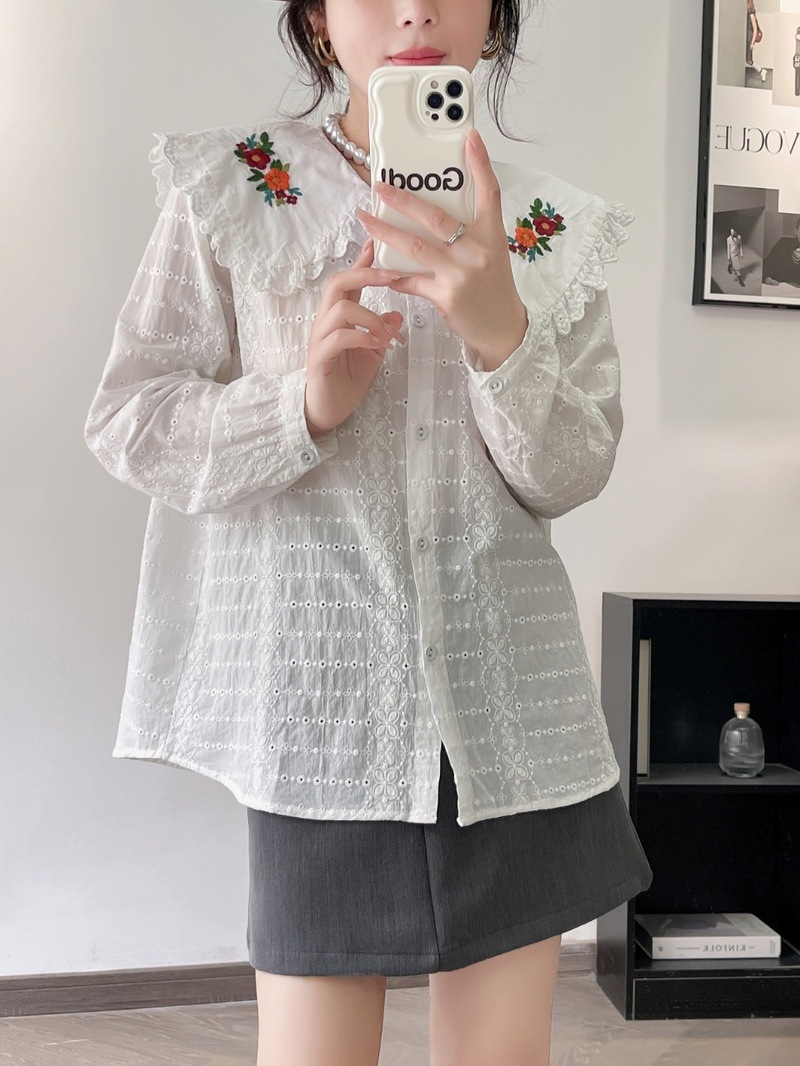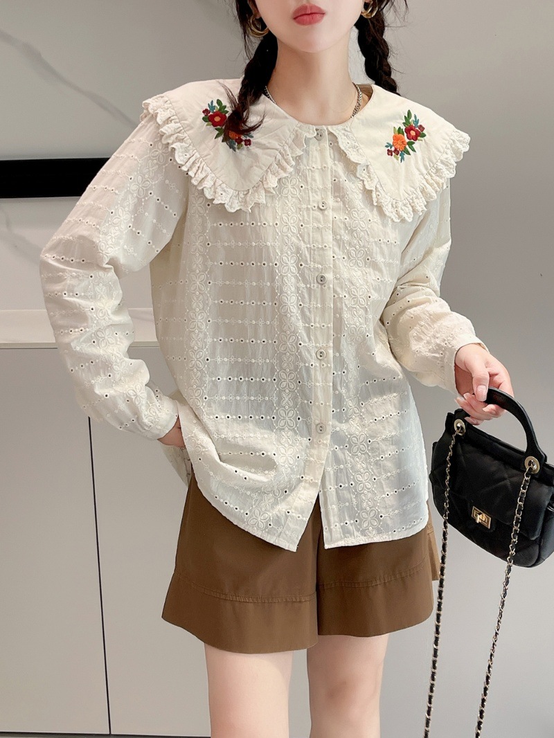 2025 봄 새로운 자수 면 인형 칼라 느슨한 요정 긴 소매 셔츠 여성 도매 조수스토어 가기