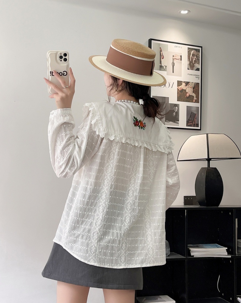 2025 봄 새로운 자수 면 인형 칼라 느슨한 요정 긴 소매 셔츠 여성 도매 조수
