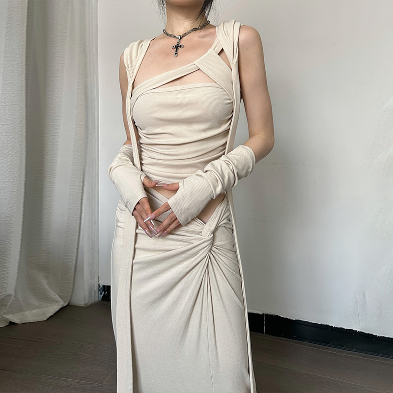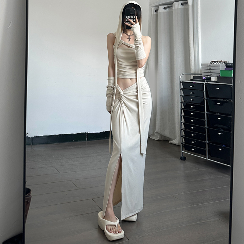 W060ST 유럽과 미국의 스파이스 걸스 2023 여름 새로운 민소매 풀오버 섹시 슬링 짧은 스플릿 긴 여자 세트