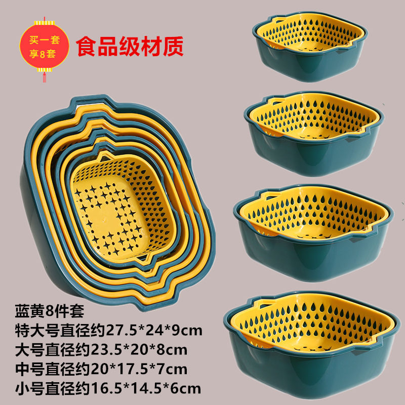 • 파란색과 노란색 [특대+대+중+소] 8종세트 원형 2단 배수바구니 [외부대야+빠른배수]