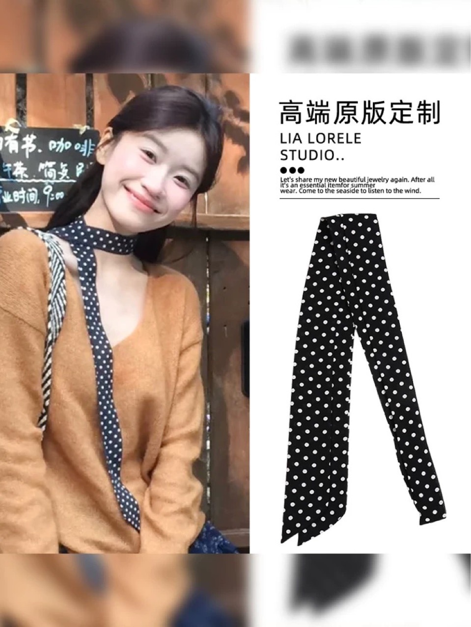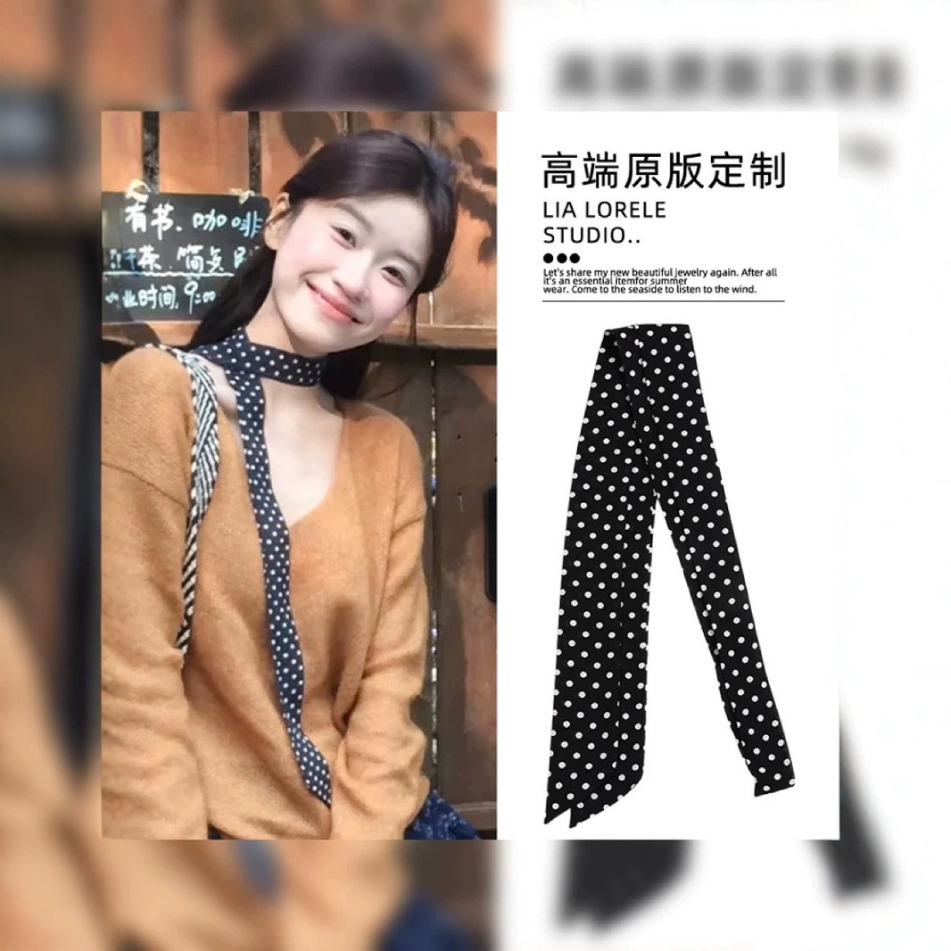 한국의 분위기 감각 ~ 블랙 웨이브 도트 긴 실크 스카프 이른 봄 고급 감각 조커 목 헤어 밴드 얇은 스카프 여성