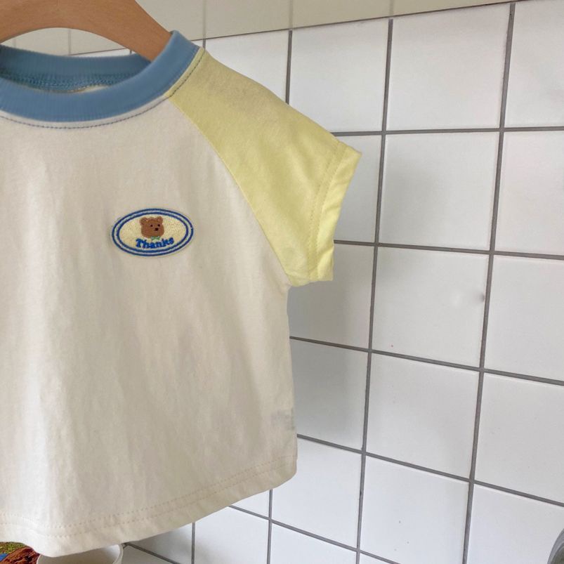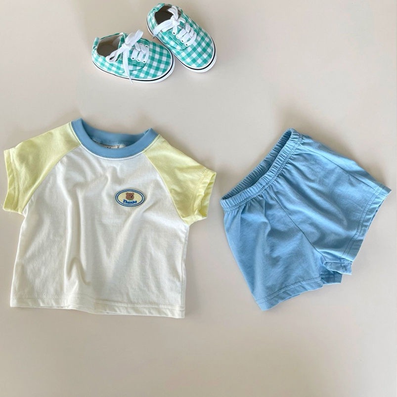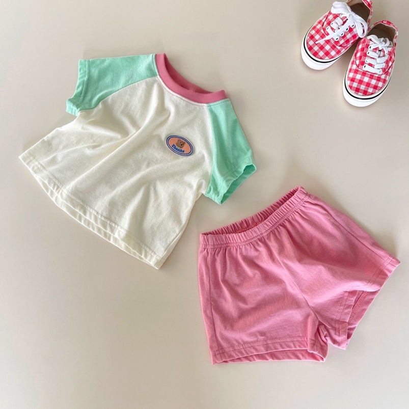 소년 소녀 여름 투피스 세트 아기 세련된 어린이 성격 유행 브랜드 캔디 컬러 접합 반팔 티셔츠 반바지스토어 가기