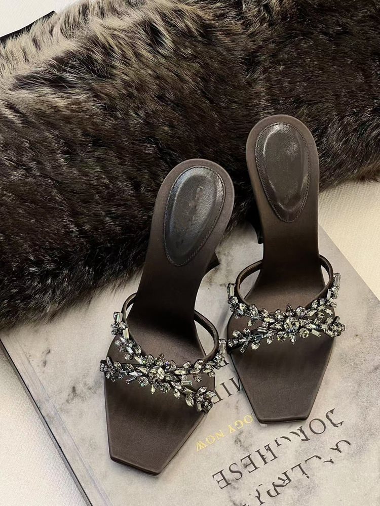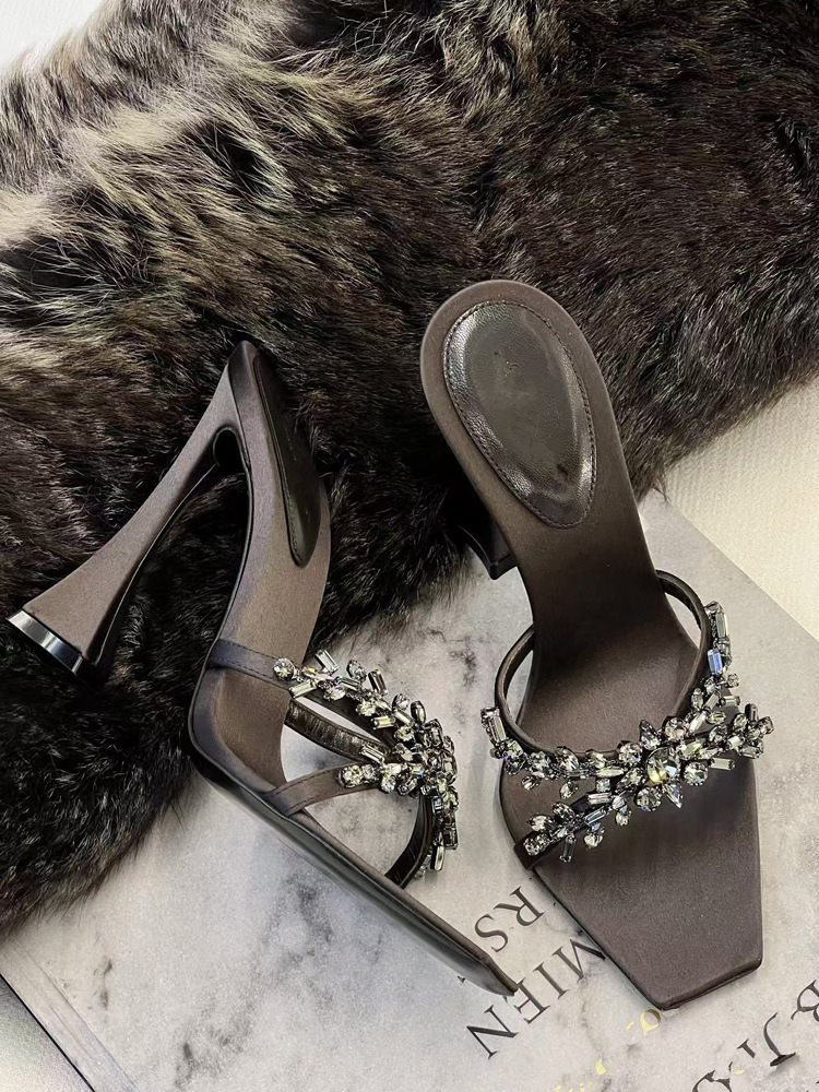 봄 광장 머리 새틴 새로운 도착 스틸레토 힐 신발 크로스 여성 섹시한 여성 2025 우아한 라인스톤 하이힐 샌들 블랙스토어 가기
