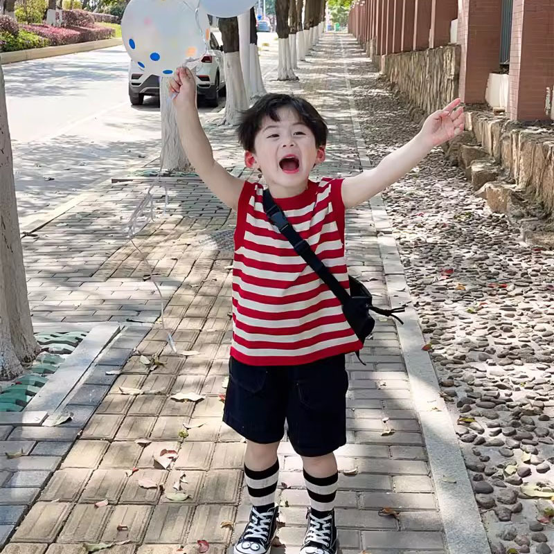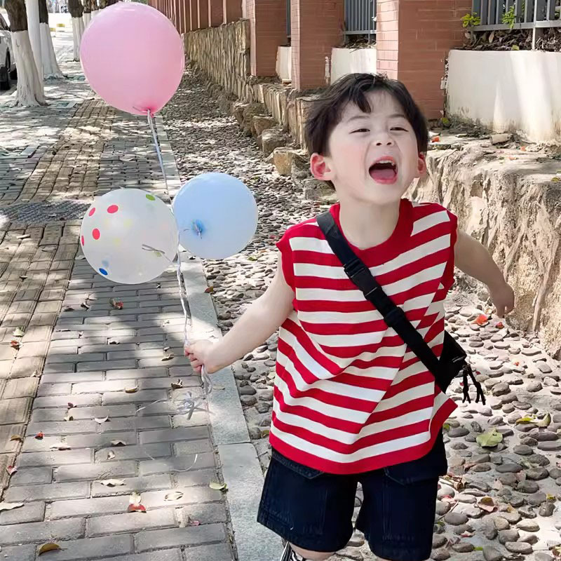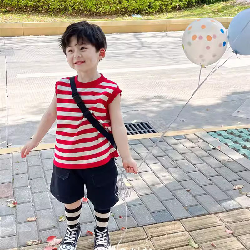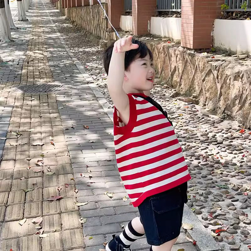 [한샤오샤오] 한국 아기 서양식 줄무늬 조끼 탑 여름 컬러 매칭 라운드 넥 민소매 티셔츠